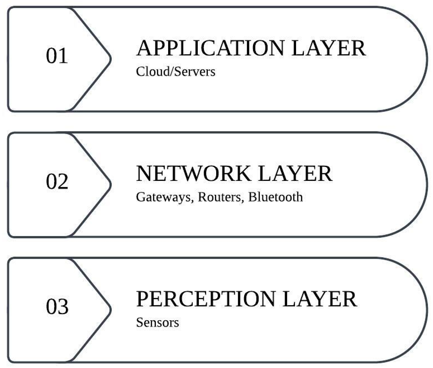 - Application layer: The application layer is the top layer. It is accountable for transmitting data to the specified location as necessary. The Internet of Things has three layers, as shown in Figure 2.
