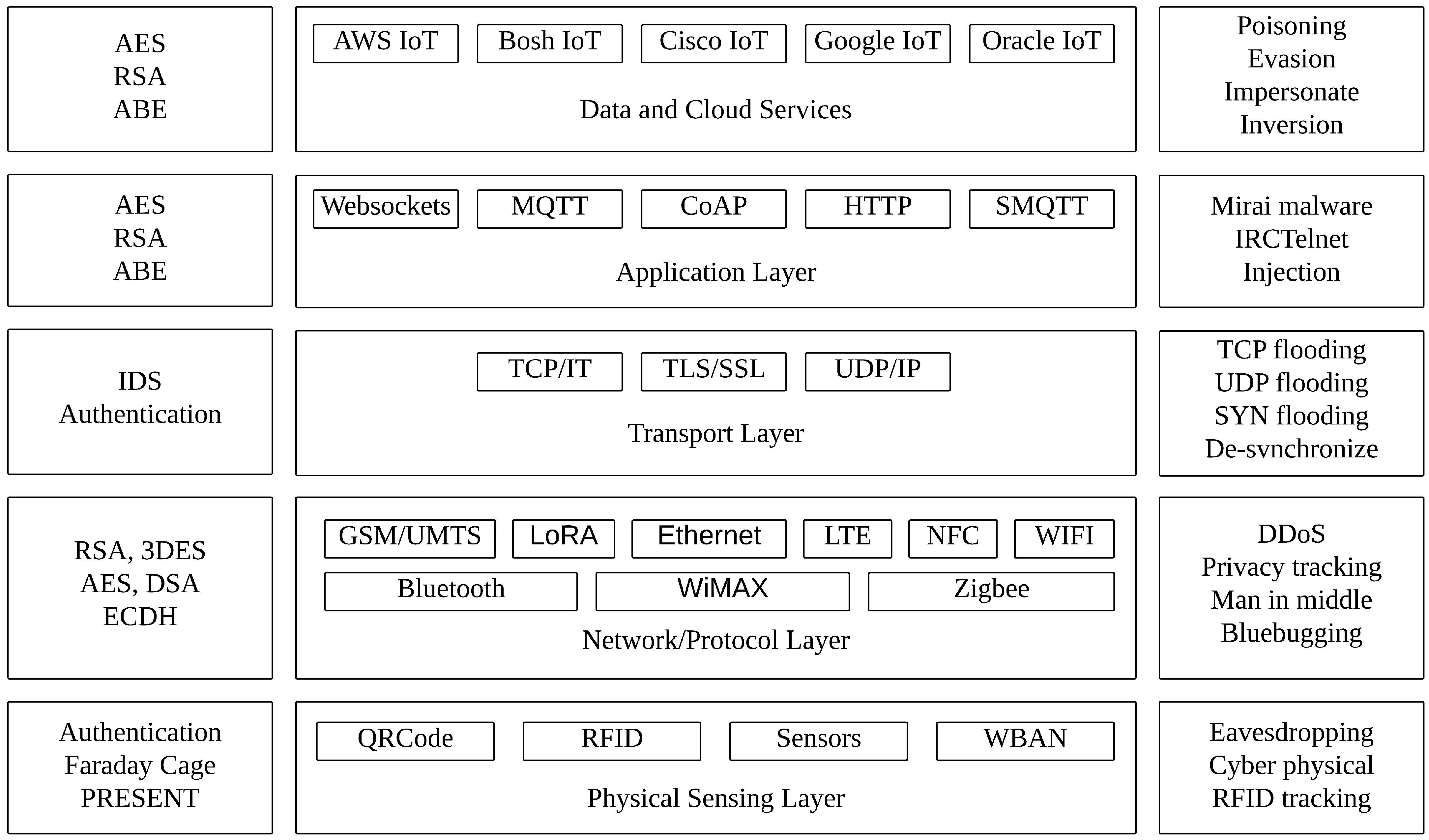 Network/ Transport | Sinkhole, unfairness, false routing, hello and session flooding, eavesdropping. | Tag attacks: cloning, spoofing. Reader attacks: impersonation, eavesdropping, network protocol attacks. |