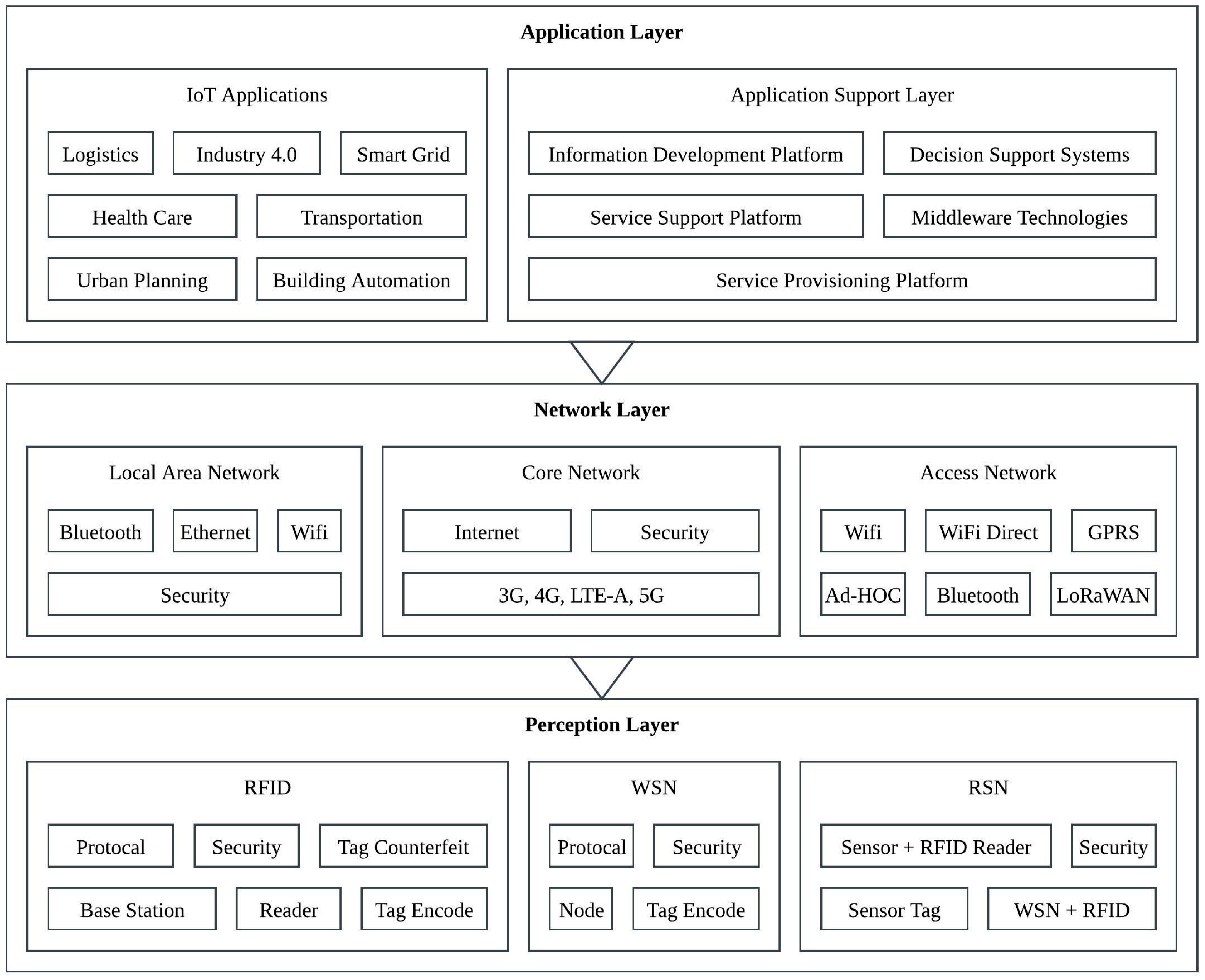 - Application layer (equivalent to Application layer in three-layer model): Manages end-user applications (e.g., smart homes, healthcare, transport). Security controls: role-based access, strong authentication (e.g., MFA, biometrics), and secure APIs.