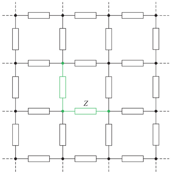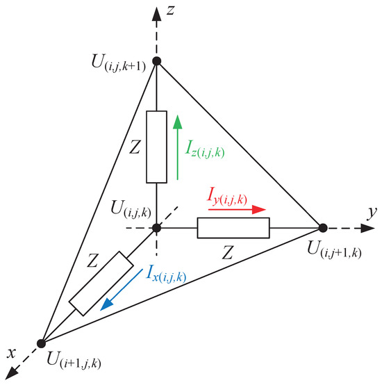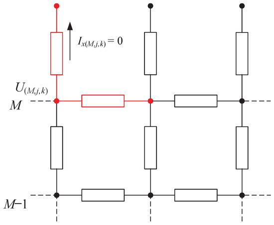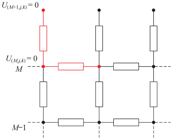 For an upper boundary node, if there is no adjacent node lying in the x, y or z direction, the current in the impedance branch in that direction is 0. If the node is located at the boundary along the x-axis, specifically where i = M, the boundary condition is = 0, as marked in red in Figure 6. Consequently, (10) is modified to