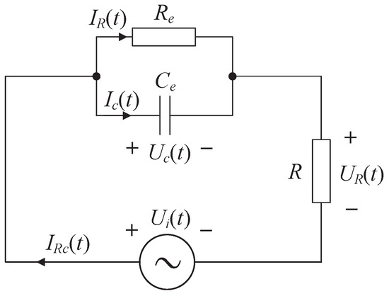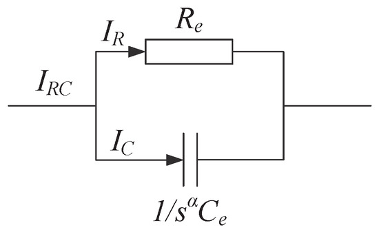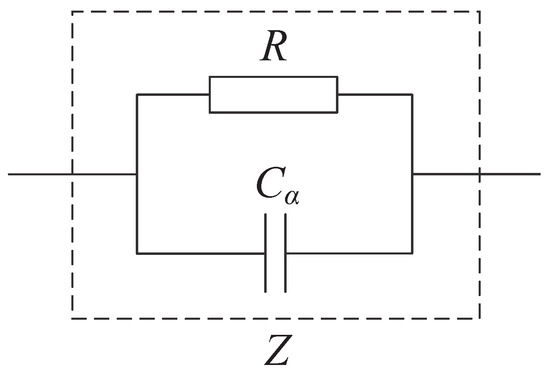Viewed from the electrodes, the entire water network can be equivalently represented as a parallel combination of a resistor and a fractional-order capacitor, where and denote their values, respectively, as shown in Figure 14.