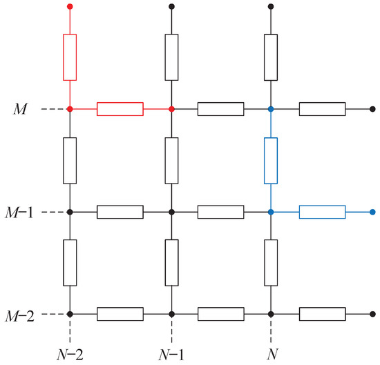 First, (13) is modified to boundary condition (15) based on the condition that the voltage of the grounded node is set to zero. Second, the voltage at the boundary endpoint of the node is also set to zero. For instance, if the node is located on the x-axis boundary, i.e., i = M, as marked in red in Figure 5, then the boundary condition = 0 can be obtained, and (10) is modified to the boundary condition as follows: