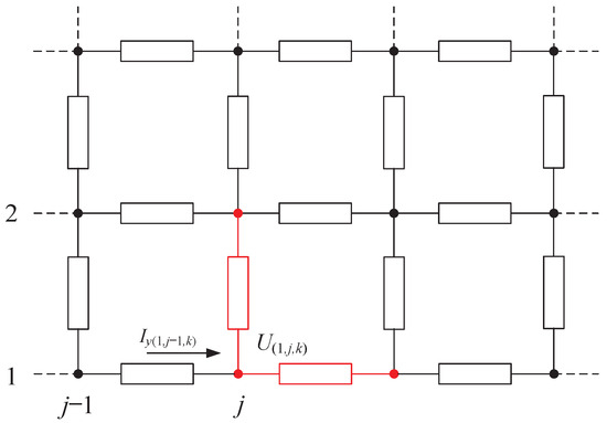 Nodes situated at the lower boundary do not have input current from the impedance branch of the lower unit. For instance, if a node is marked as the lower boundary of an x-axis unit (i = 1), the currents entering the node include and , as shown in Figure 7. If the node is insulated without any external injected current, and the boundary condition includes = 0, then the term in (13) should be set to 0.