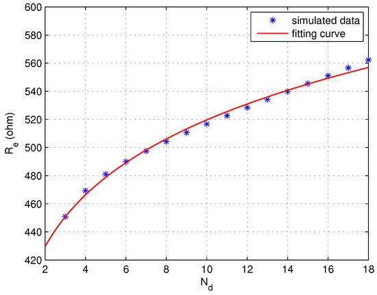 The obtained and are put into the network for simulation, and the curve of equivalent resistance changing with D is obtained, as shown by the red curve in Figure 13. It can be seen that the variation in estimated with D is close to the actual situation.