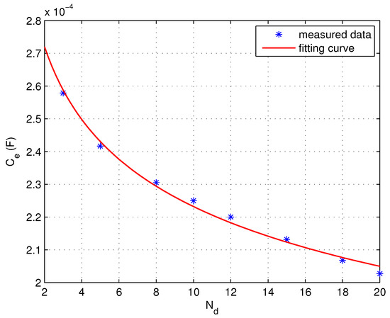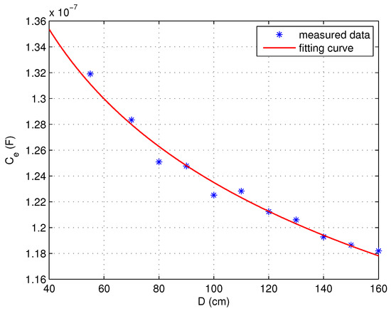 The equivalent capacitance corresponding to different electrode spacings is obtained, as shown in Figure 19. It can be observed that decreases with the increase of D. According to (35) and (36), the relationship between and D depends on the expression for the grid cell capacitance C. A power function is used to describe the variation in C with D,