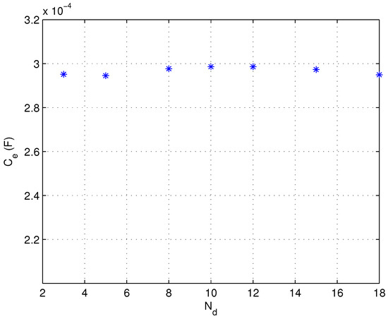 Under different numbers of grids, to keep the equivalent capacitance constant, the capacitance of the grid units C needs to be adjusted based on . Therefore, the expression for C is assumed to be