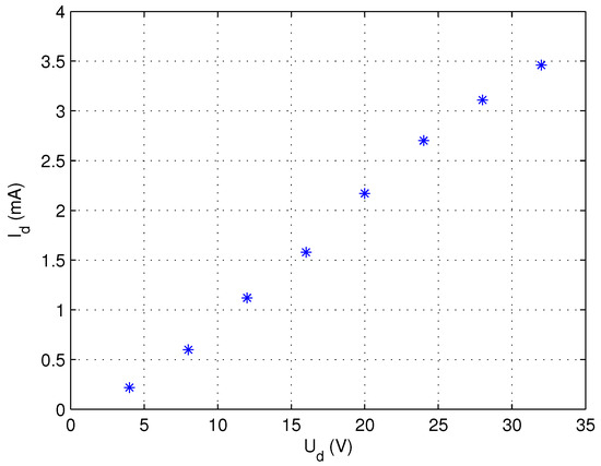 To determine , the relationship between electrode spacing (D) and equivalent resistance () is investigated. A measurement experiment is performed: a pair of electrodes are immersed in water and connected to a DC power supply. Then a loop connecting the power source and the water is formed. The input voltage is increased gradually while both the input voltage and loop current are recorded simultaneously. For a fixed electrode spacing, the voltage-current () characteristic curve is obtained, as shown in Figure 12. It can be seen that increases linearly with . Therefore, a linear function can be used to fit the sampled data, and its slope can be viewed as the equivalent resistance of the charged water body.