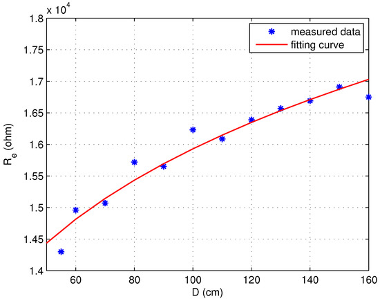 Collecting the data under different electrode spacing, the equivalent resistance corresponding to different electrode spacing can be obtained as shown by the data points in Figure 13. It can be observed that increases with the increase in D. According to (33) and (34), the relationship between and D depends on the expression of the grid cell resistance R. A power function is used to describe the variation in R with D,