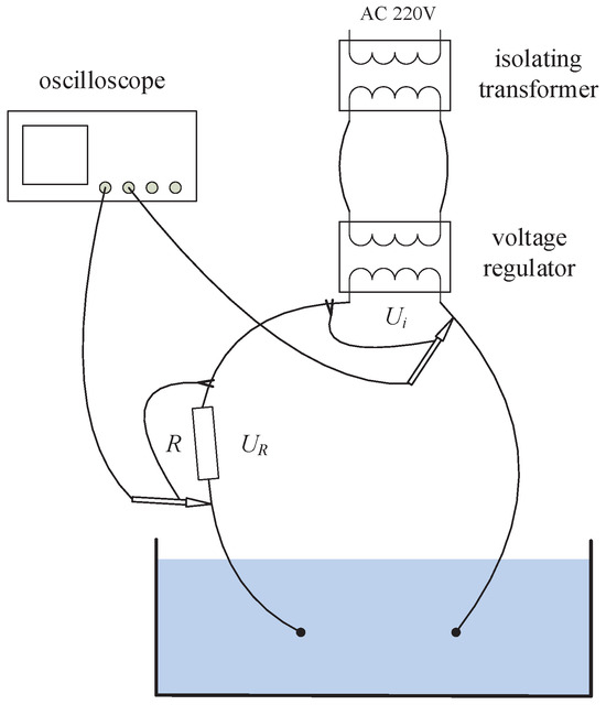 The schematic diagram of the charged water body measurement experiment is shown in Figure 15. The electrodes are placed in water, and the distance between the electrodes is measured. The waveforms of the voltage and are captured using an oscilloscope. The equivalent circuit of the experimental circuit is shown in Figure 16.