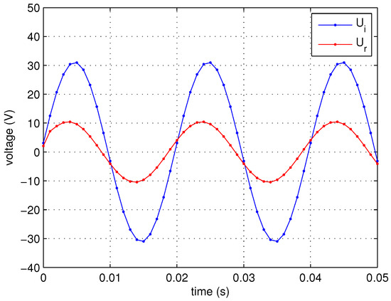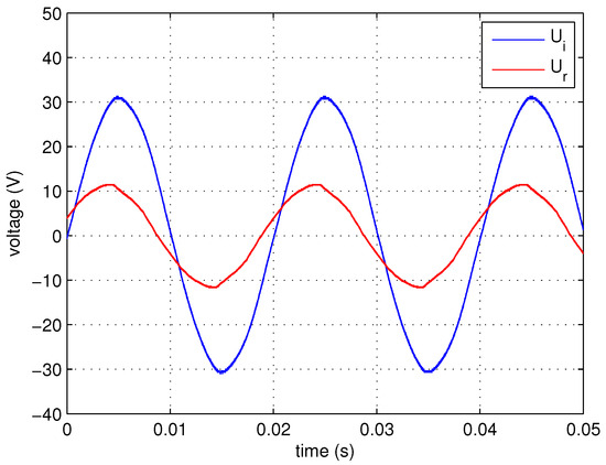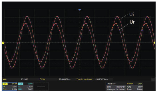 Secondly, the leak current between the electrodes is investigated. A set of measurements are performed. The electrode spacing is set as 50 cm to 160 cm and the voltages and are recorded simultaneously. Model simulations are conducted under the same conditions, and the data collected from the experiment are compared with the data obtained from the model simulations. For example, Figure 24 and Figure 25 depict the waveforms of and obtained from the experiment and model simulation, respectively, when the electrode spacing is 50 cm.