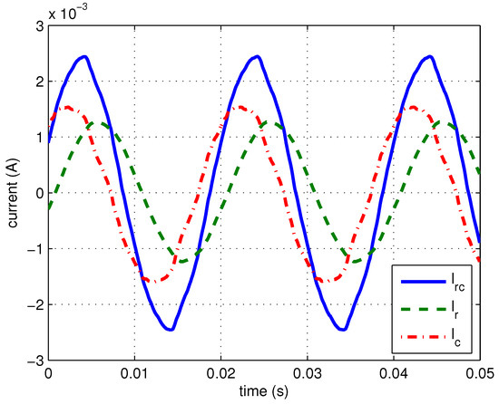 The measured values of and are shown in Figure 17. It can be derived that , and . Since the equivalent resistance between the electrodes has been obtained through a DC voltage experiment, the current flowing through can be determined by . By subtracting the calculated from the measured total current , the current flowing through can be obtained, as illustrated in Figure 18.