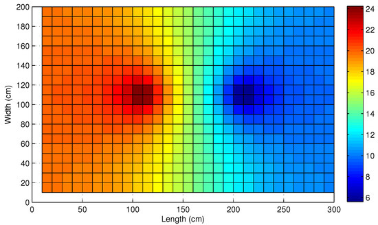 A sinusoidal voltage source with a peak-to-peak value of 30 V and frequency of 50 Hz is applied to perform the test. The size of the water tank is 300 cm × 200 cm × 50 cm, and the electrodes are positioned at (100, 100, 30) and (200, 100, 30) (cm), respectively. Simulation is performed and the distribution of the peak-to-peak value of AC voltage at a depth of 20 cm in the charged water body is depicted in Figure 20.