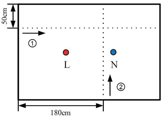 To validate the effectiveness of the charged water body model, the simulation results are compared with those obtained by actual experiments. Firstly, the voltage distribution of the charged water body is investigated. The experiment is performed under the same condition as applied in simulation. The measurement scheme is shown in Figure 21. Two sequences of voltage measurements are performed along the length and width of the pool, respectively, which are labeled as ➀ and ➁ in Figure 21, respectively. The spacing between adjacent measurement points is 10 cm. The depth of all the measurement points is 20 cm.