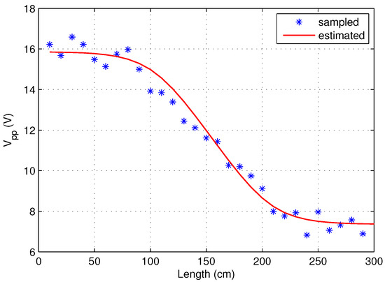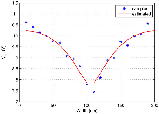 The distribution of the measured peak-to-peak voltage along the length and width of the pool are displayed as data points in Figure 22 and Figure 23, respectively. In addition, the estimated voltage distribution is also displayed in Figure 22 and Figure 23. It can be observed that the estimated voltage distribution is close to the sampled data.