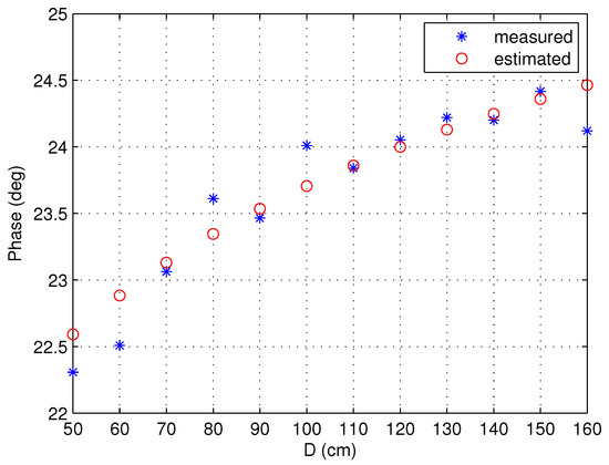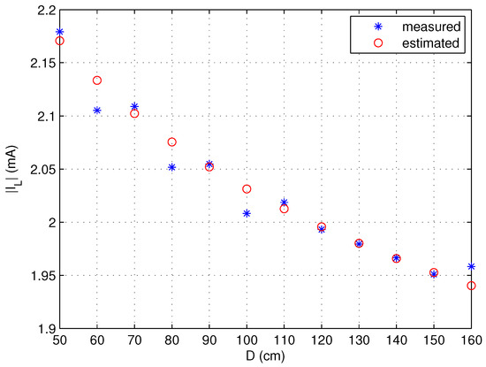 The charged water body can be characterized by the amplitude of the leak current and its phase relative to input voltage . Therefore, the amplitude of the leak current and its phase lead relative to are calculated for different electrode distances. The measured and simulated amplitudes of are shown in Figure 26, and the measured and simulated phase leads of relative to are shown in Figure 27. As depicted in Figure 26 and Figure 27, the voltage amplitude and phase estimated by the model closely match the measured values in the intermediate distance range (90–150 cm), but exhibit larger deviation when the electrode distance is too small (50 cm, 60 cm, 70 cm) and too large (160 cm). This validates the model’s effectiveness within its optimal operational range.