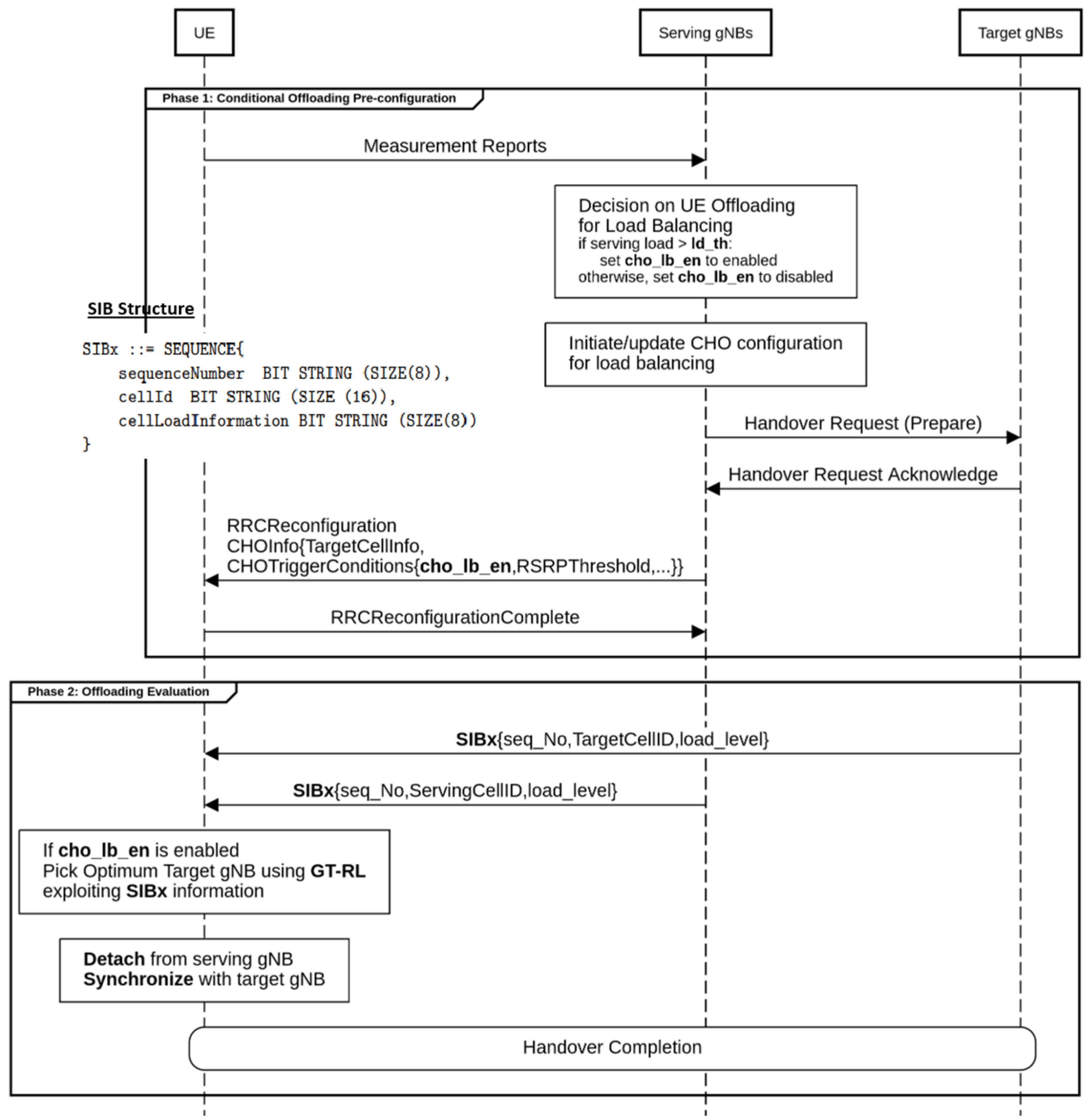, can also be set depending on the demand of the network operator during the configuration phase. The serving gNB then sends a Radio Resource Control (RRC) reconfiguration message containing CHO configuration parameters to the UEs. The UEs receive the CHO configuration and start monitoring the pre-configured events and conditions, i.e, the load state of the serving and candidate gNBs.