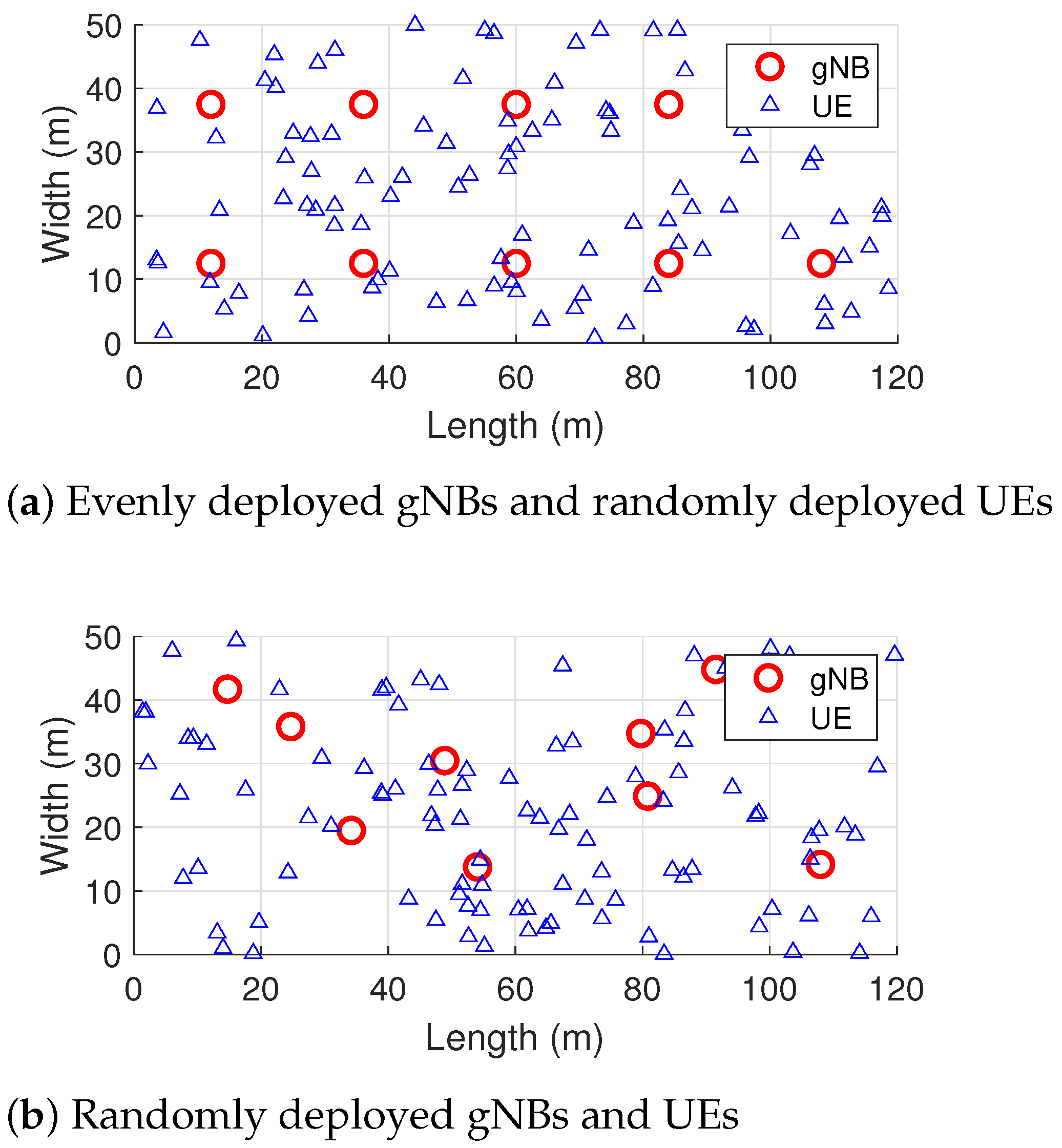 Figure 4a, gNBs are regularly distributed over the whole indoor area, whereas the UEs are placed randomly. In the second scenario shown in