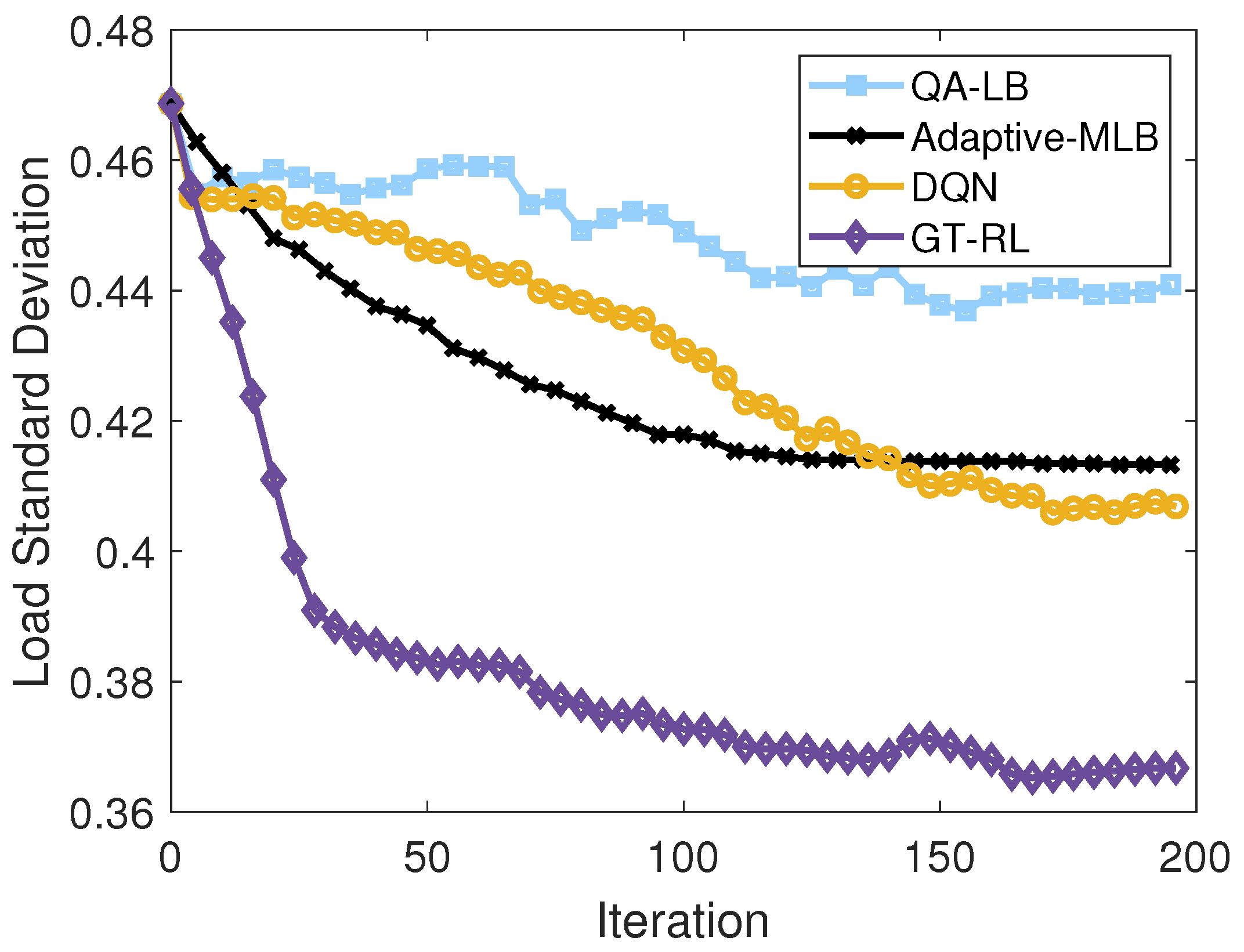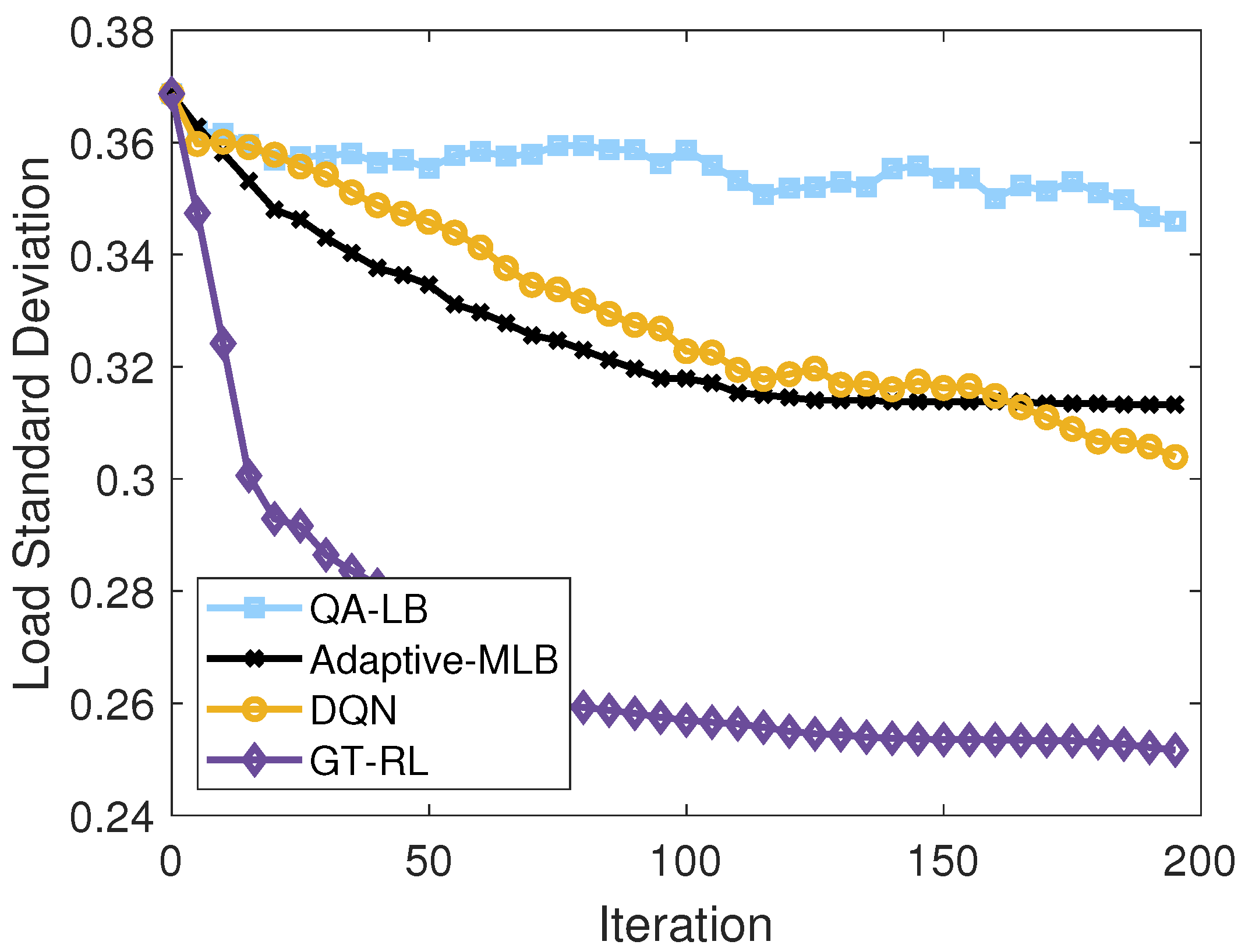 Figure 4a. The proposed method demonstrated high adaptability, achieving convergence to an even load distribution more rapidly than the other algorithms. The steep decline in variance during the initial iterations of the load-balancing process indicates strong adaptability by the GT-RL method. Three key ideas described in