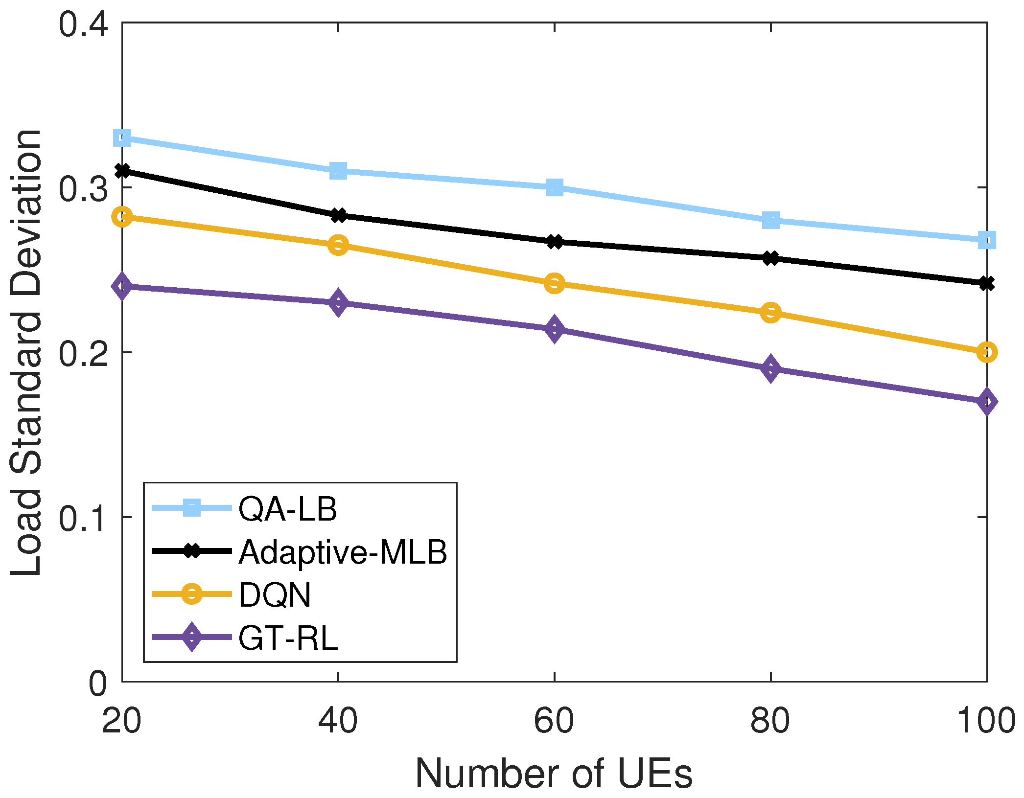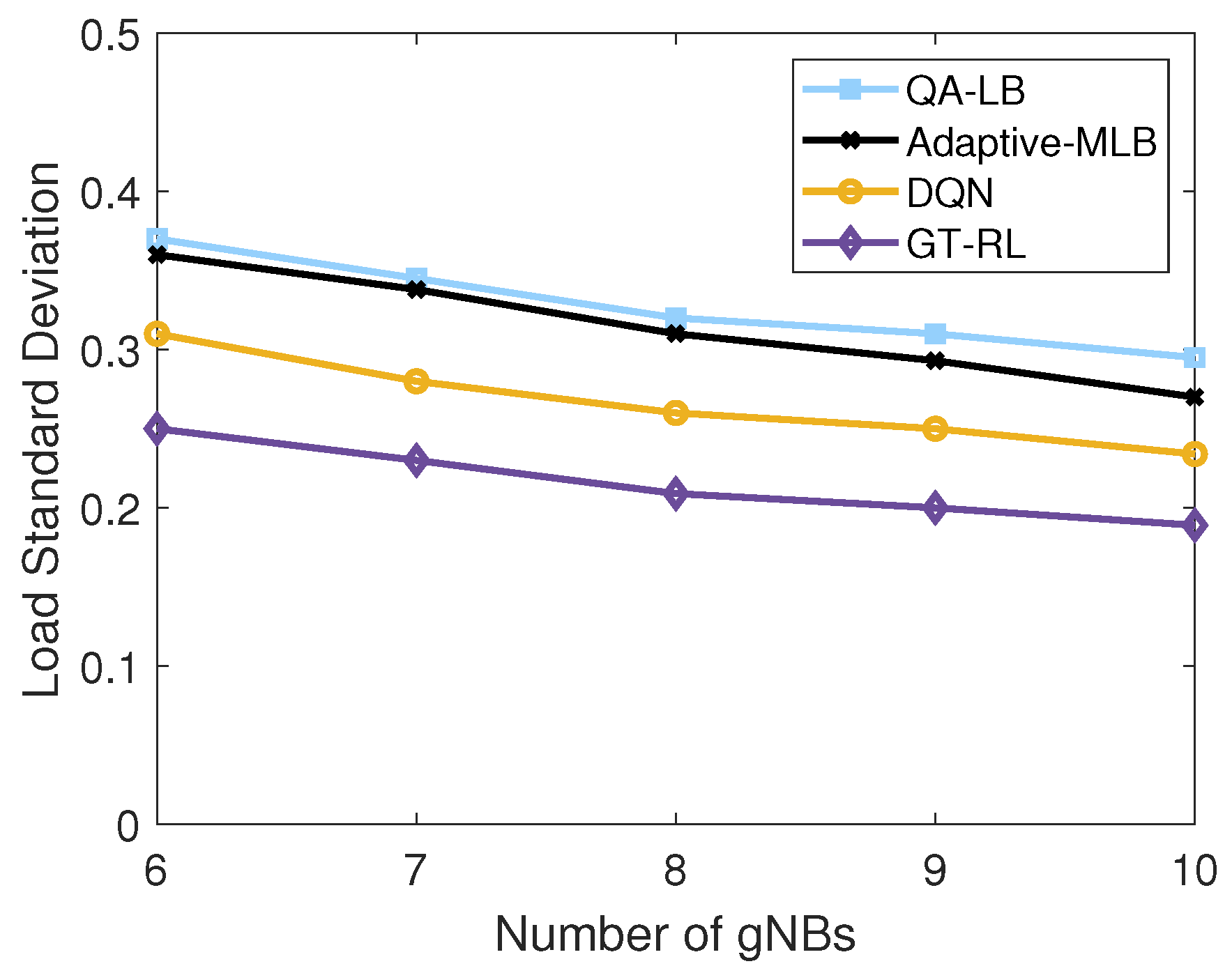 Figure 13 shows the comparison in load distributions. The proposed method achieved a more even load distribution reflected by the lowest standard deviation. The load-aware conditional offloading idea is adaptable to various network sizes because it enables UEs to dynamically choose the gNB that provides the best possible service. As the number of gNBs in the network increases, the UEs associated with an overloaded cell have more options for offloading. Consequently, the load variance decreases, reflecting a more even load distribution. For the various load conditions considered, the GT-RL algorithm achieved the lowest variance with a performance gain of