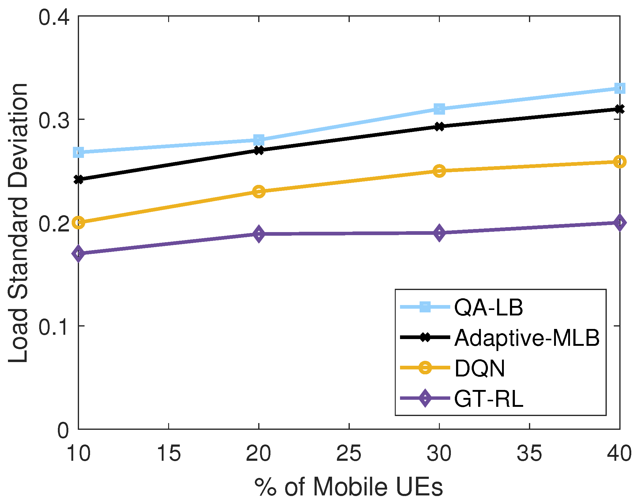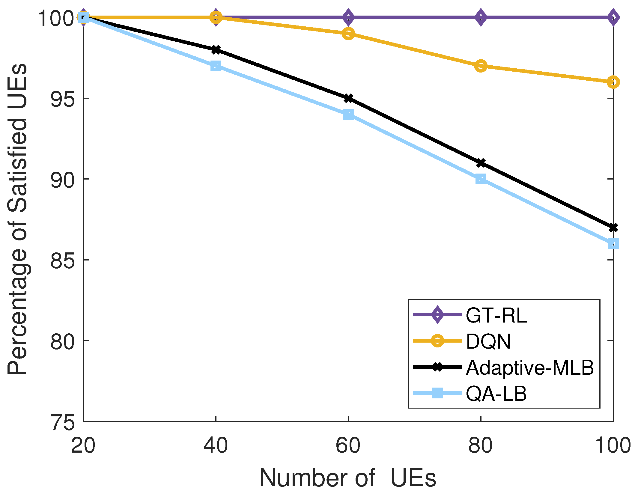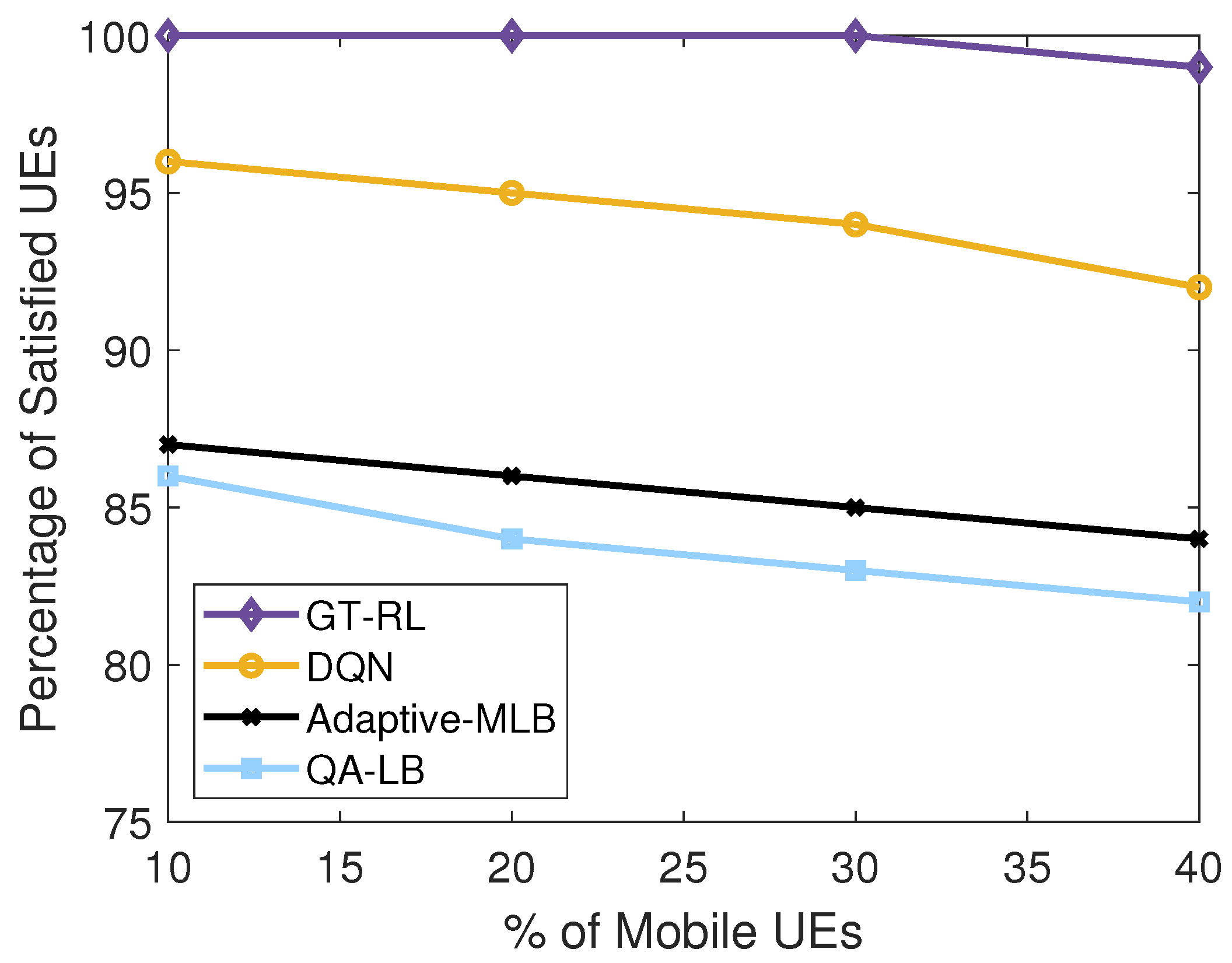 Figure 12, respectively. Owing to its highly adaptive nature, the GT-RL method is robust under dynamic conditions and achieved nearly 100% UE satisfaction. The performance of the other algorithms was significantly affected as the percentage of dynamic UEs increased because they lack a specialized technique that makes them highly adaptive. When the number of dynamic UEs is set to 40%, the proposed method achieved an 8% gain in satisfied UEs compared to DQN-MLB and at least a 15% gain compared to the other two algorithms, as seen in