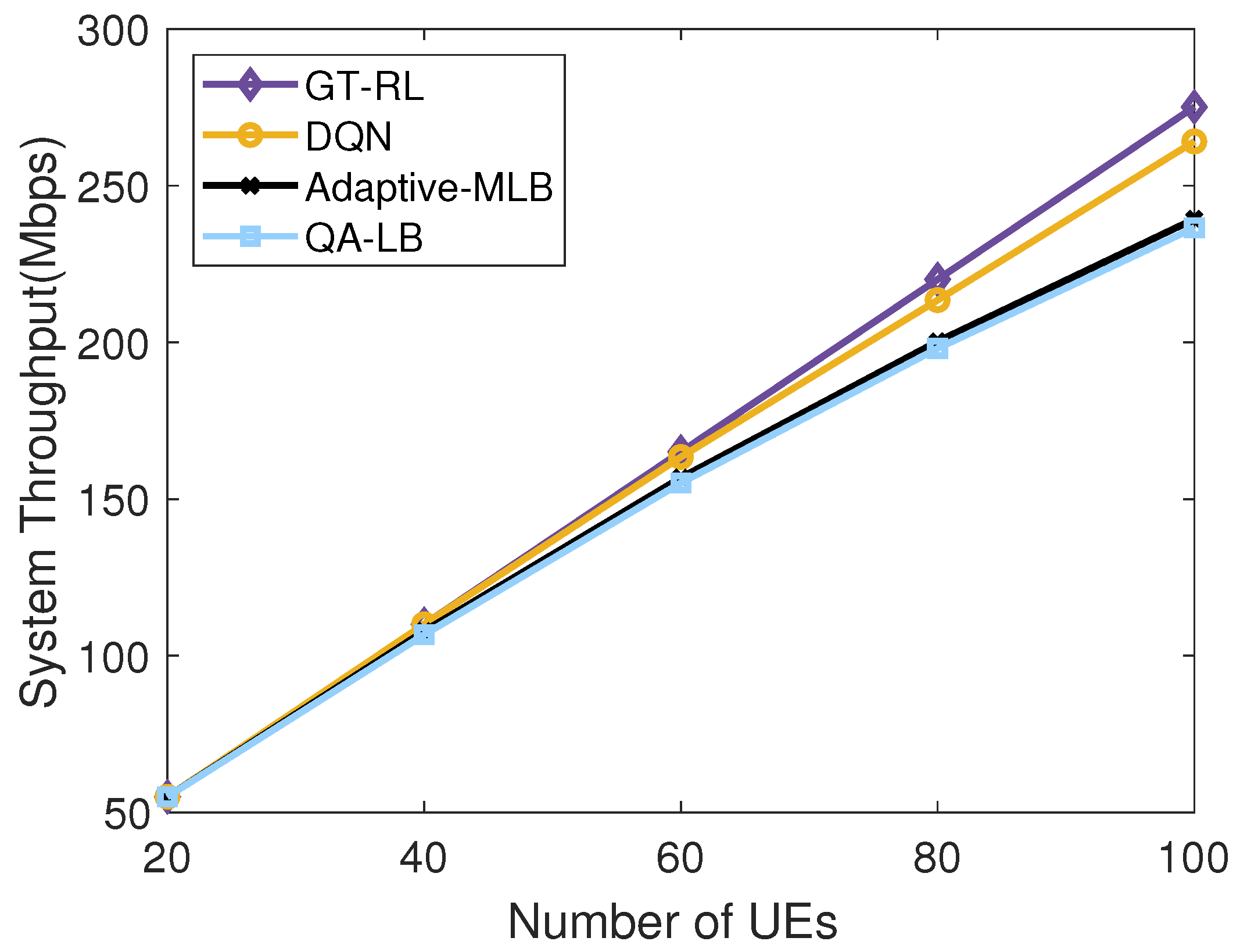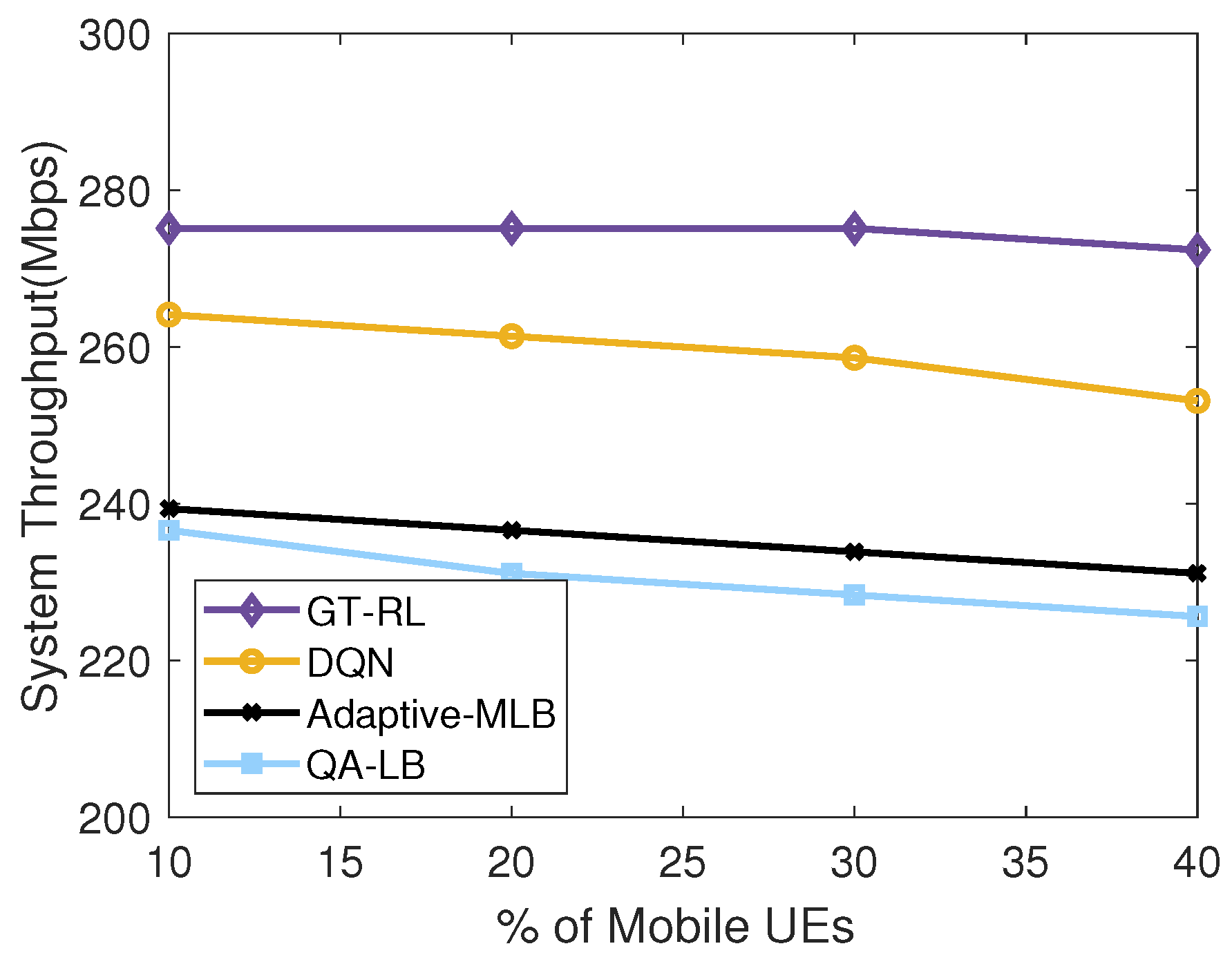 Figure 11. The proposed method enhanced system throughput by 7.61% compared to DQN-MLB and by at least 17% compared to the other algorithms. Overall, the GT-RL method demonstrated superior performance under dynamic load conditions due to its highly adaptive nature, consistently achieving higher throughput and close to 100% UE satisfaction.