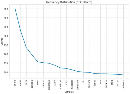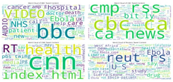 We created word clouds for health news tweets from BBC, CNN, CBC, and Reuters to gain an initial understanding of the distribution of language within the datasets. Figure 1 illustrates that the predominant terms are associated with health topics and methods of communication. Terms such as Ebola, cancer, hospital, NHS, patient, and death highlight the significance of discussions related to outbreaks and clinical matters. Conversely, platform-specific markers (video, rt, index, html) illustrate the mechanisms through which social media disseminates information. The repeated use of these terms provides qualitative evidence that news media shape specific health narratives in the online space, which aligns with the objective of the study to pinpoint shifts in public discourse from offline to online contexts.