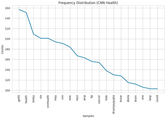 An analysis of the CNN dataset revealed a notable emphasis on general health research, studies, and lifestyle recommendations, with CNN branding prominently displayed (see Figure 4). The dataset encompasses topics related to weight loss, fitness, and health maintenance, frequently featuring insights from Dr. Sanjay Gupta and health tips from CNN. The analysis revealed that the dataset primarily focuses on medical disorders and health issues impacting women, children, and specific conditions such as cancer and heart disease. The topic of weight loss holds significant importance in the realm of health and fitness. Terms such as “weightloss,” “food,” “tip,” and “getfit” indicate that the emphasis should be on guidance related to nutrition, physical activity, and overall wellness.