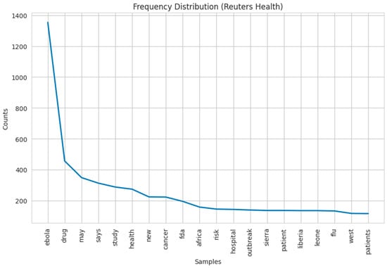 The examination of the Reuters dataset revealed a significant emphasis on medical studies, regulatory matters, and disease management, particularly concerning diabetes, cardiovascular diseases, and pharmaceutical approvals (see Figure 5). The dataset emphasizes the health of women and children, particularly in relation to clinical trials, treatment strategies, and diseases such as cancer. The dataset encompasses outbreaks of infectious diseases, such as Ebola, concentrating on their impact on African nations, particularly Sierra Leone. The subject matter can be readily linked to outbreaks of infectious diseases, such as Ebola, particularly in regions like Africa and Sierra Leone. Terms such as “outbreak,” “hospital,” “patient,” “case,” and “ebola” are utilized to discuss the impact of disease epidemics on public health systems, particularly in African nations. The primary emphasis will probably be on managing and maintaining documentation related to these health emergencies.