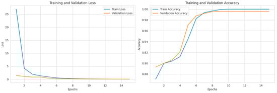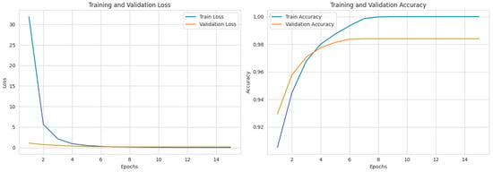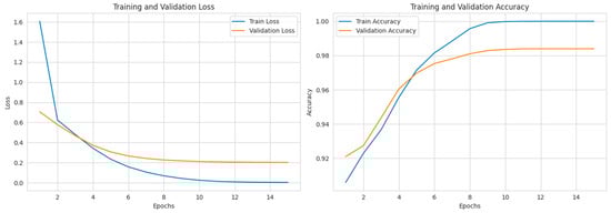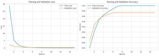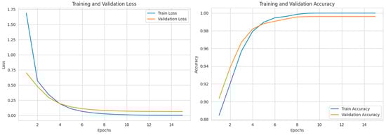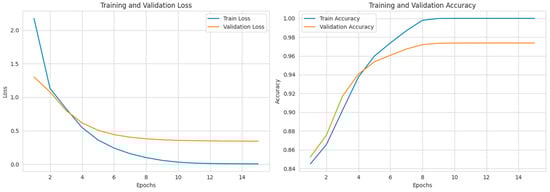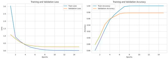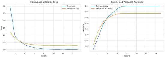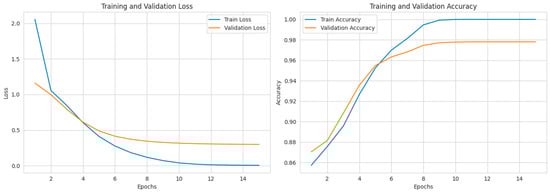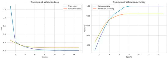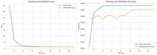 The Transformer-VAE applied to CNN health-news tweets demonstrates rapid learning and achieves stable performance. The training loss decreases significantly during the initial three to four epochs, subsequently approaching zero. The validation loss decreases rapidly to a stable level without any late-epoch increase, indicating that the model is not experiencing overfitting. Accuracy increases significantly from approximately 0.86 to a validation plateau of around 0.973–0.974 by epochs 6–7. Training accuracy stabilizes at approximately 1.00 shortly thereafter (see Figure 14). A brief mid-epoch crossing, where validation performance slightly exceeds training performance, is a typical artifact of optimization rather than an indication of instability. The curves indicate rapid convergence of the models and a minimal generalization gap. The performance of the Transformer-VAE on this dataset is comparable to that of the LSTM-VAE/GRU-VAE, indicating its effectiveness in accurately capturing the online health-discourse patterns of CNN.