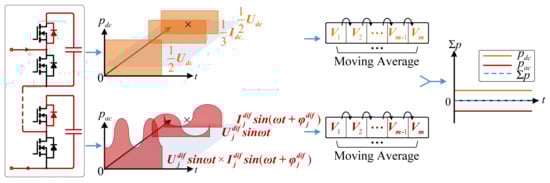 Figure 6, the product and superposition of the voltage and current components yield relatively complex expressions for instantaneous power. However, rather than focusing on the instantaneous power fluctuations, the primary concern lies in the periodic variations in the capacitor power in the upper and lower arms, namely the DC component of the power. Therefore, a moving average filter with a 0.02-s (50 Hz) time constant is applied to the output power to extract its DC component.