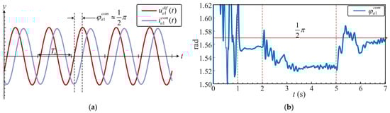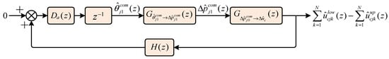 Therefore, in this study, the arm voltage balance is achieved by regulating the phase angle . However, when ≠ 0, the presence of the common-mode current induces fundamental-frequency reactive power exchange between the upper and lower arms. Direct control under these conditions would require frequent adjustments of the phase angle, which can degrade both control stability and performance. To mitigate this issue, a fundamental-frequency moving-average filter is applied to extract the DC component of the arm capacitor power for control, thereby avoiding the influence of reactive power. Furthermore, by superimposing a DC common-mode voltage (t) on the fundamental-frequency common-mode voltage (t), regulation of the average capacitor voltage of the phase is achieved.