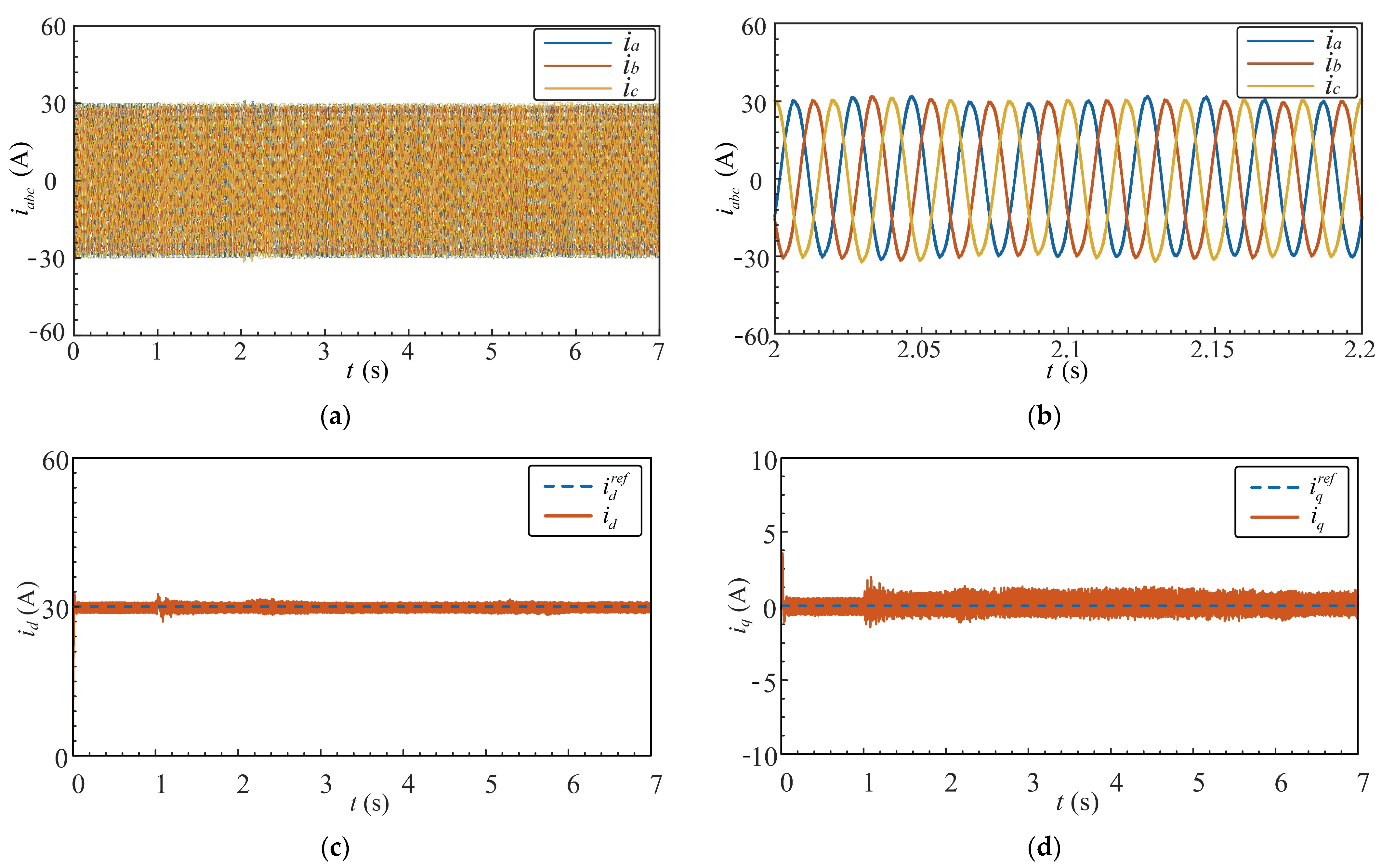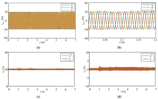 Figure 20d shows the closed-loop result of the q-axis current, which is effectively regulated to 0 A, demonstrating successful decoupled active and reactive current control.