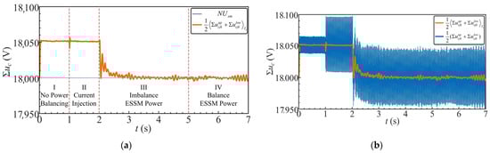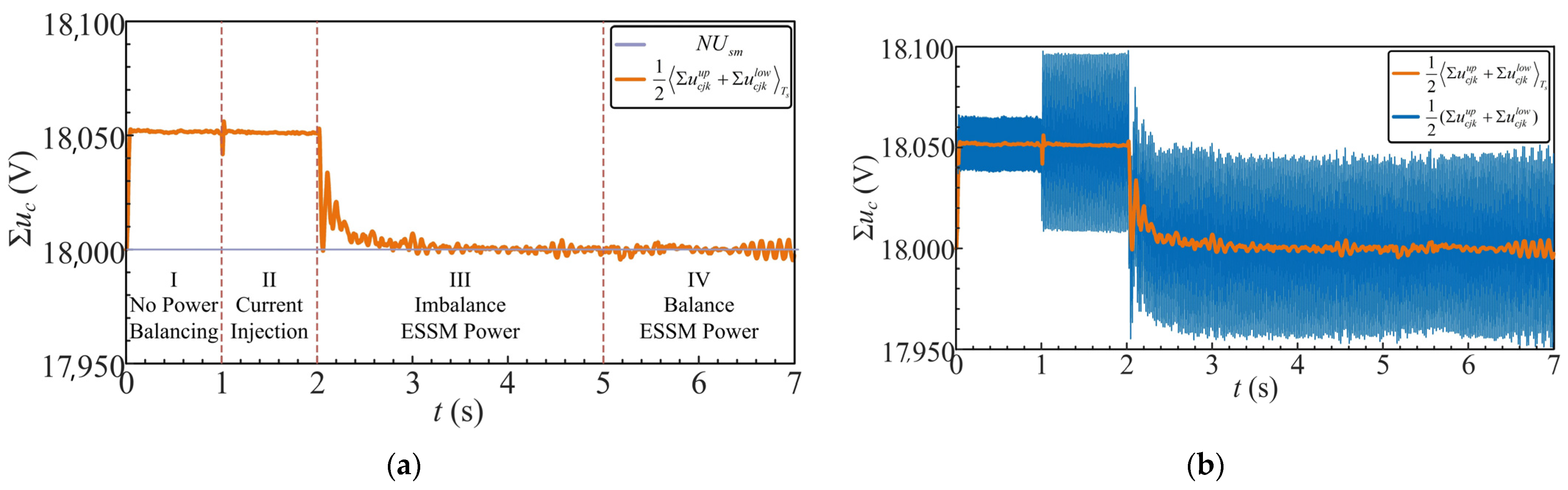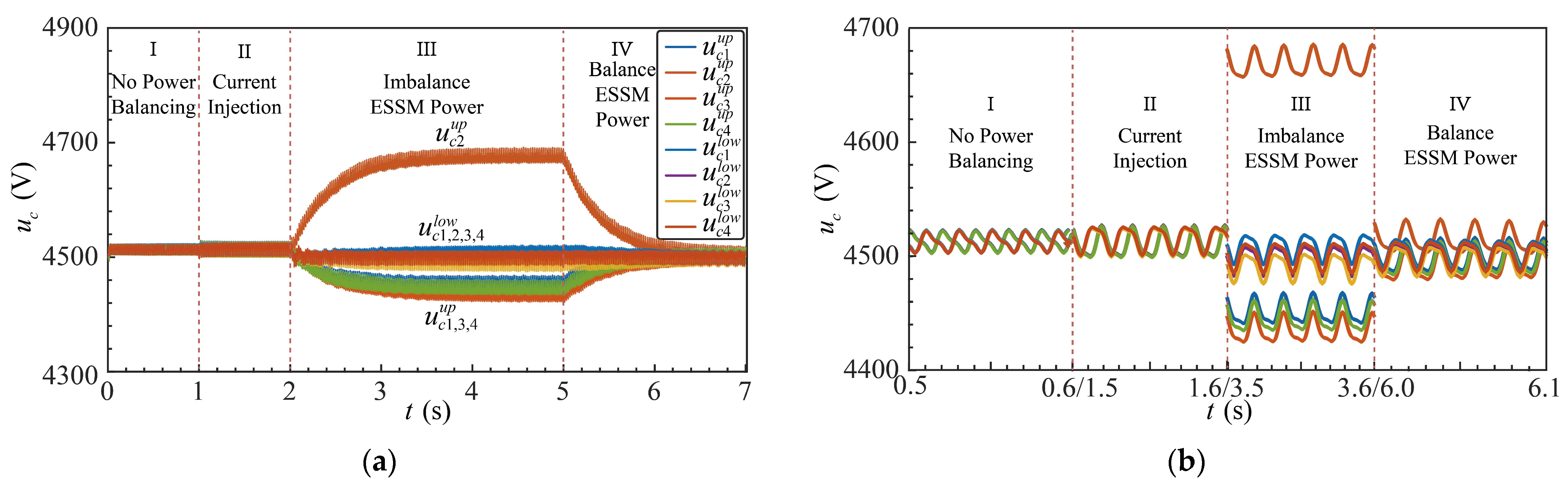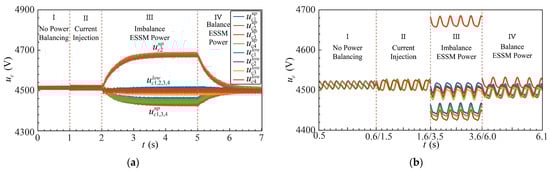 In Stage III, an unbalanced power injection of 4.5 kW = 4.5 kV × 1 A is applied to the second submodule of the upper arm. Since the capacitor voltages within the same arm are regulated by the proportional control method proposed in [