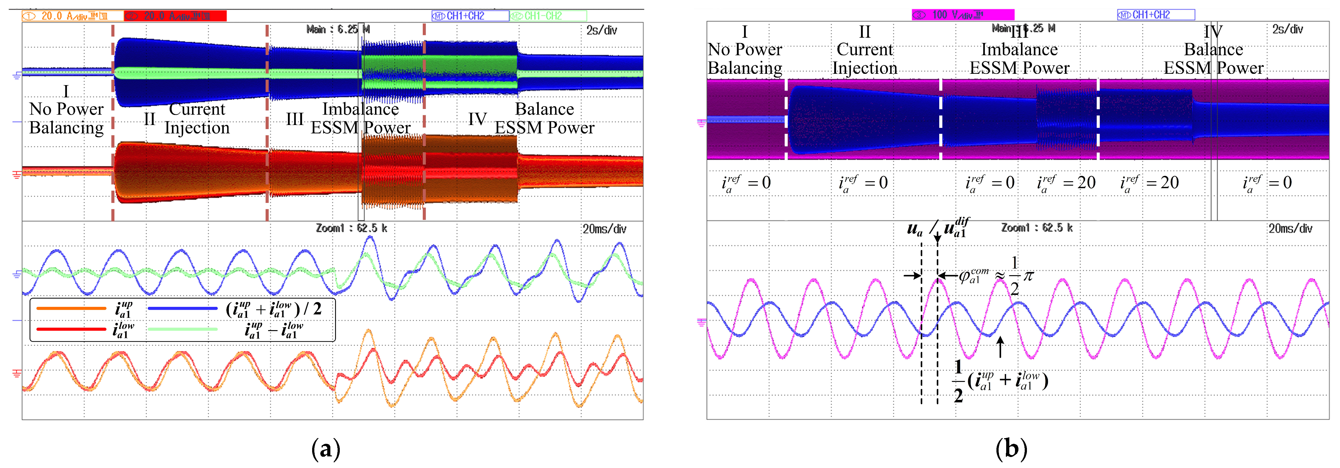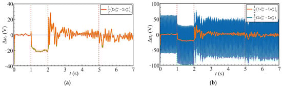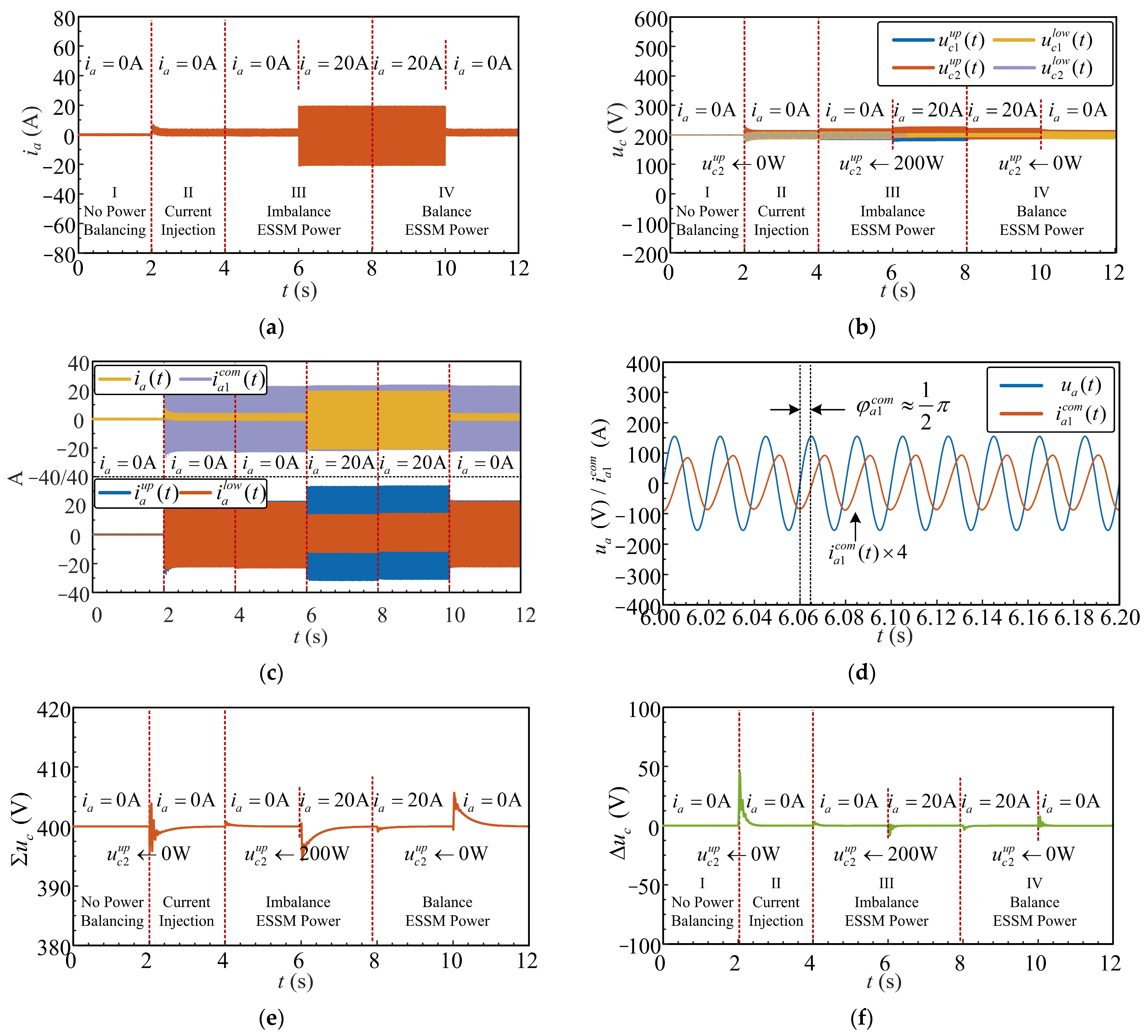 Figure 23a shows the moving-averaged differential voltages over the simulation period. In Stages II, without closed-loop compensation but, the differential voltages exhibit noticeable deviations from zero, indicating voltage imbalance between the upper and lower arms. When the common-mode voltage controller is activated in Stage III, the differential voltages are effectively suppressed and converge close to zero, demonstrating successful balancing of the arm capacitor voltages.