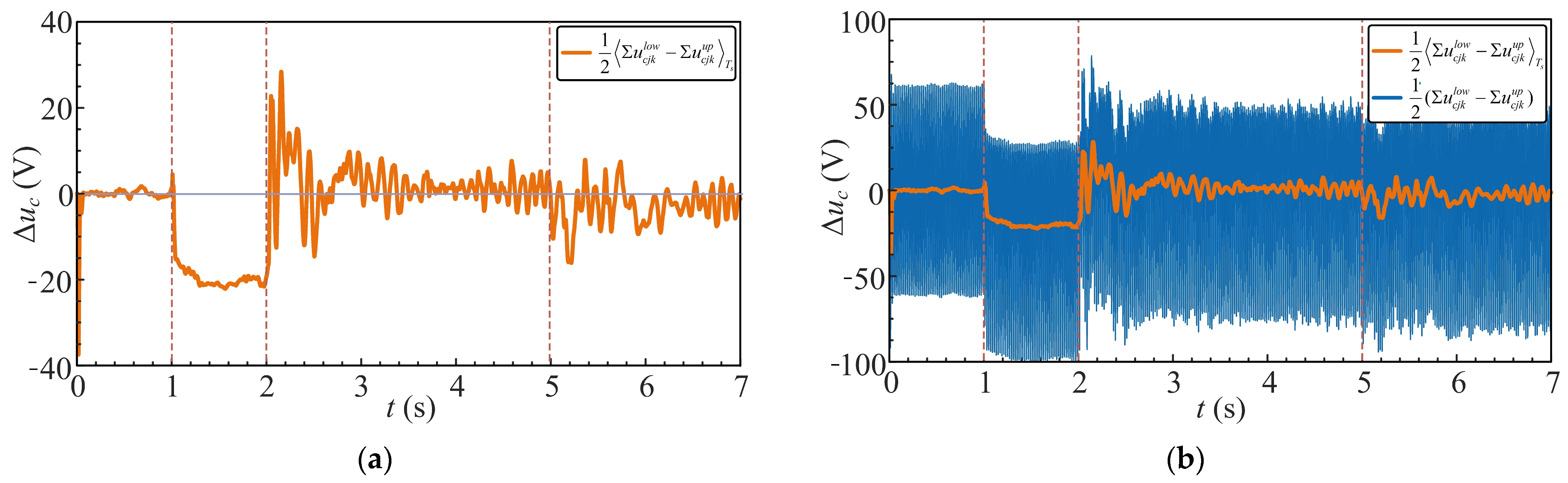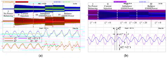 Figure 24a presents the steady-state time-domain waveform. At steady state, the capacitor voltages of the upper and lower arms are balanced, resulting in no active power exchange between the arms. According to (13) and