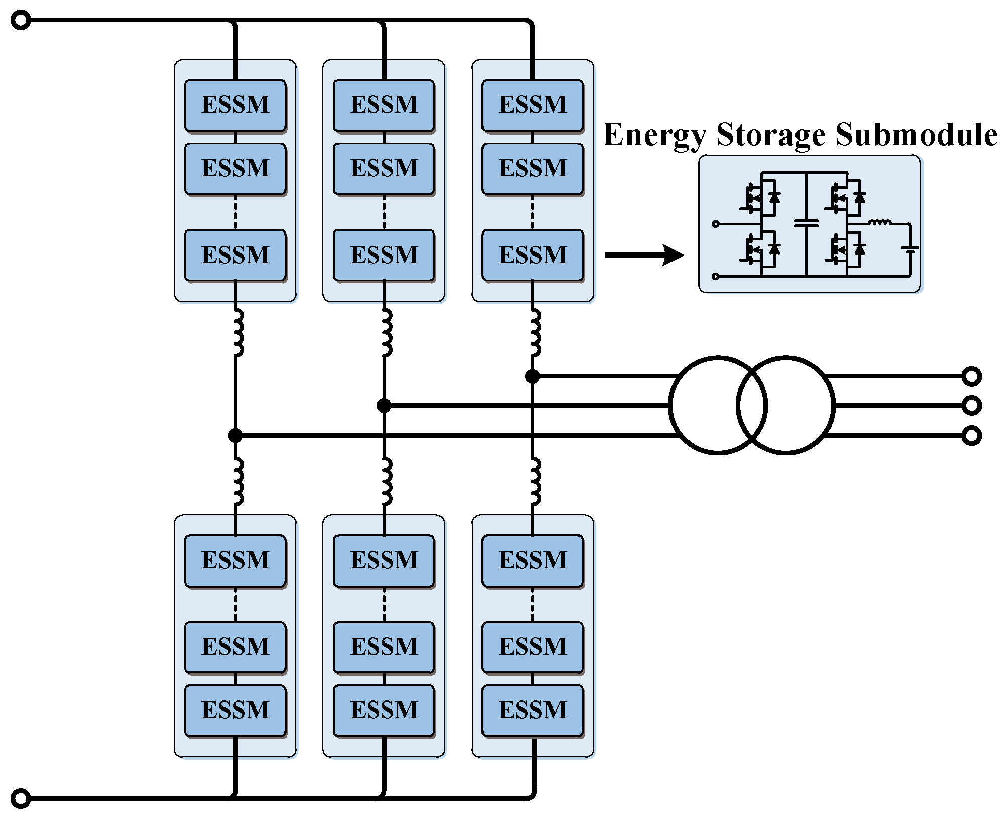 Recently, the integration of energy storage into MMCs has attracted significant attention, leading to the development of ES-MMCs. Unlike conventional MMCs, ES-MMCs incorporate batteries, supercapacitors, or hybrid storage devices directly within submodules. This enables each submodule to function as both a power conversion stage and an independent energy storage unit, enhancing system flexibility and enabling bidirectional power exchange with the AC grid and DC link. ES-MMCs support grid stability, frequency regulation, peak shaving, fault tolerance, and operation under weak grid or islanded conditions, making them particularly suitable for renewable energy integration and hybrid power management.