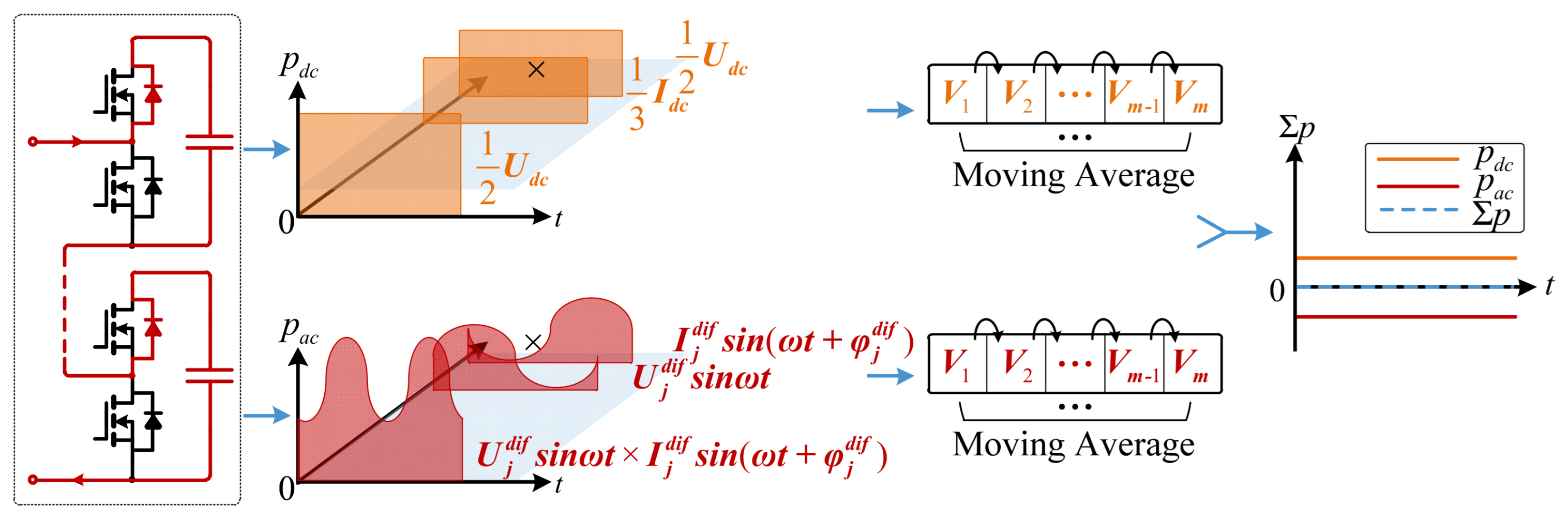 The DC components of the arm powers can be further decomposed into common-mode and differential-mode parts in (11). Specifically, the averaged common-mode and differential-mode power components over the window