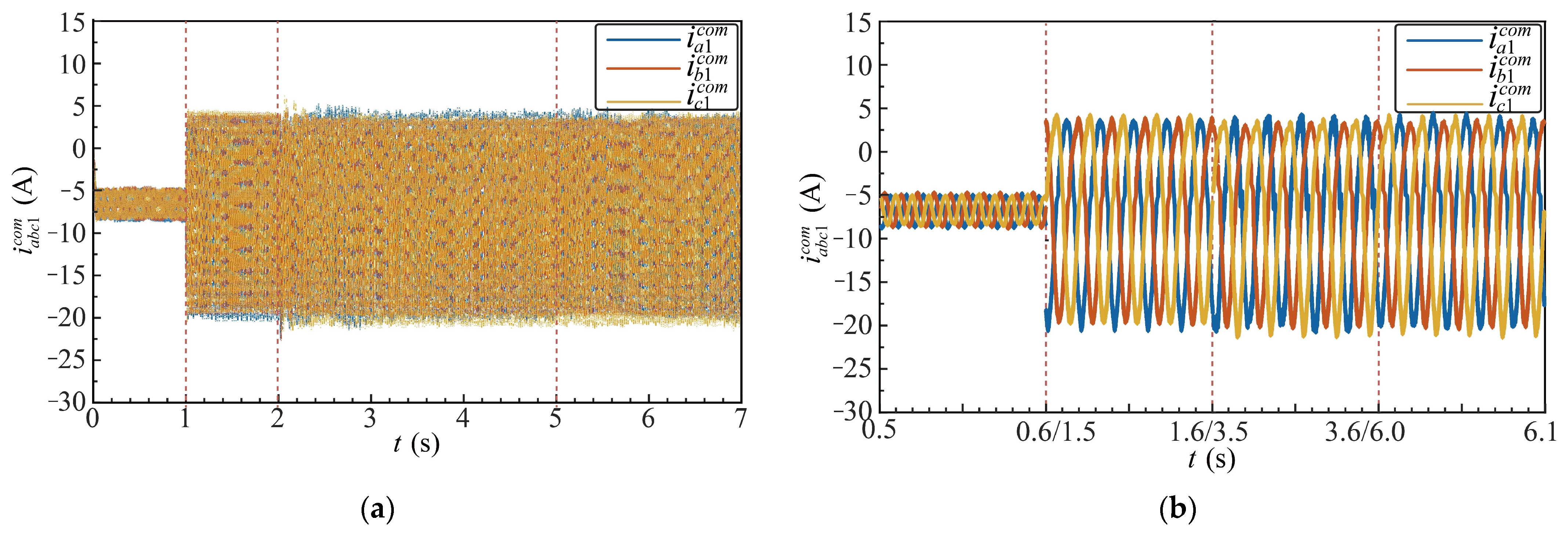 Figure 25a presents the time-domain waveforms over the entire simulation. In Stage I, the fundamental common-mode currents are primarily caused by fluctuations in the submodule capacitor voltages. From Stages II to IV, after superimposing the common-mode voltage