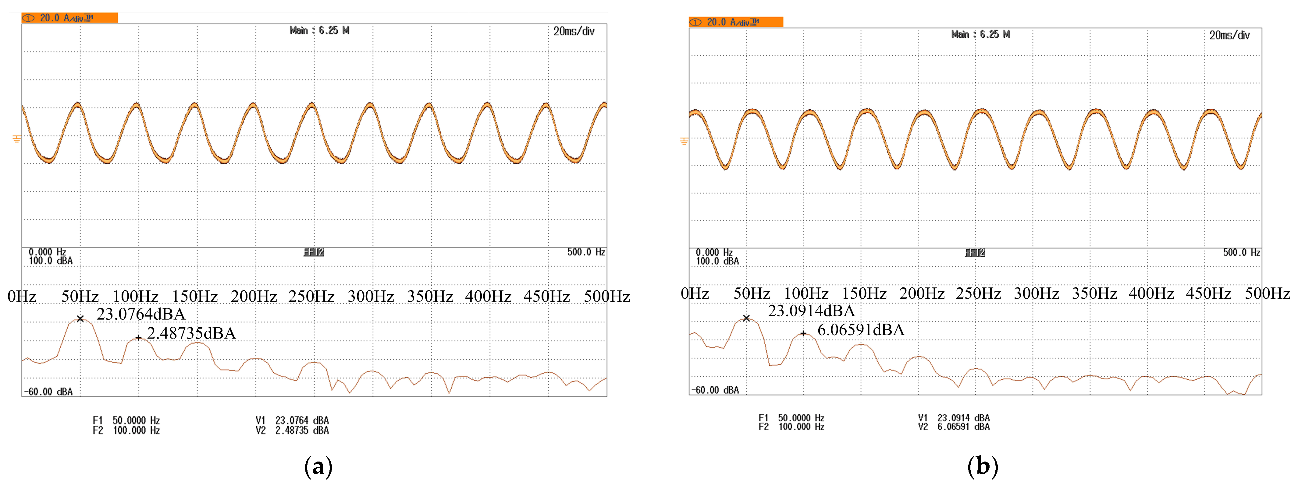 ia = 20 A, measured by an oscilloscope. The FFT is performed with respect to the 50 Hz and its harmonics. The dominant component of the grid current is the 50 Hz, which remains nearly unchanged before and after applying the proposed capacitor voltage balancing algorithm (23.0764 dBA vs. 23.0914 dBA). In contrast, the second-order harmonic increases from 2.48735 dBA to 6.06591 dBA when the control algorithm is enabled.