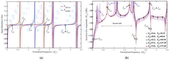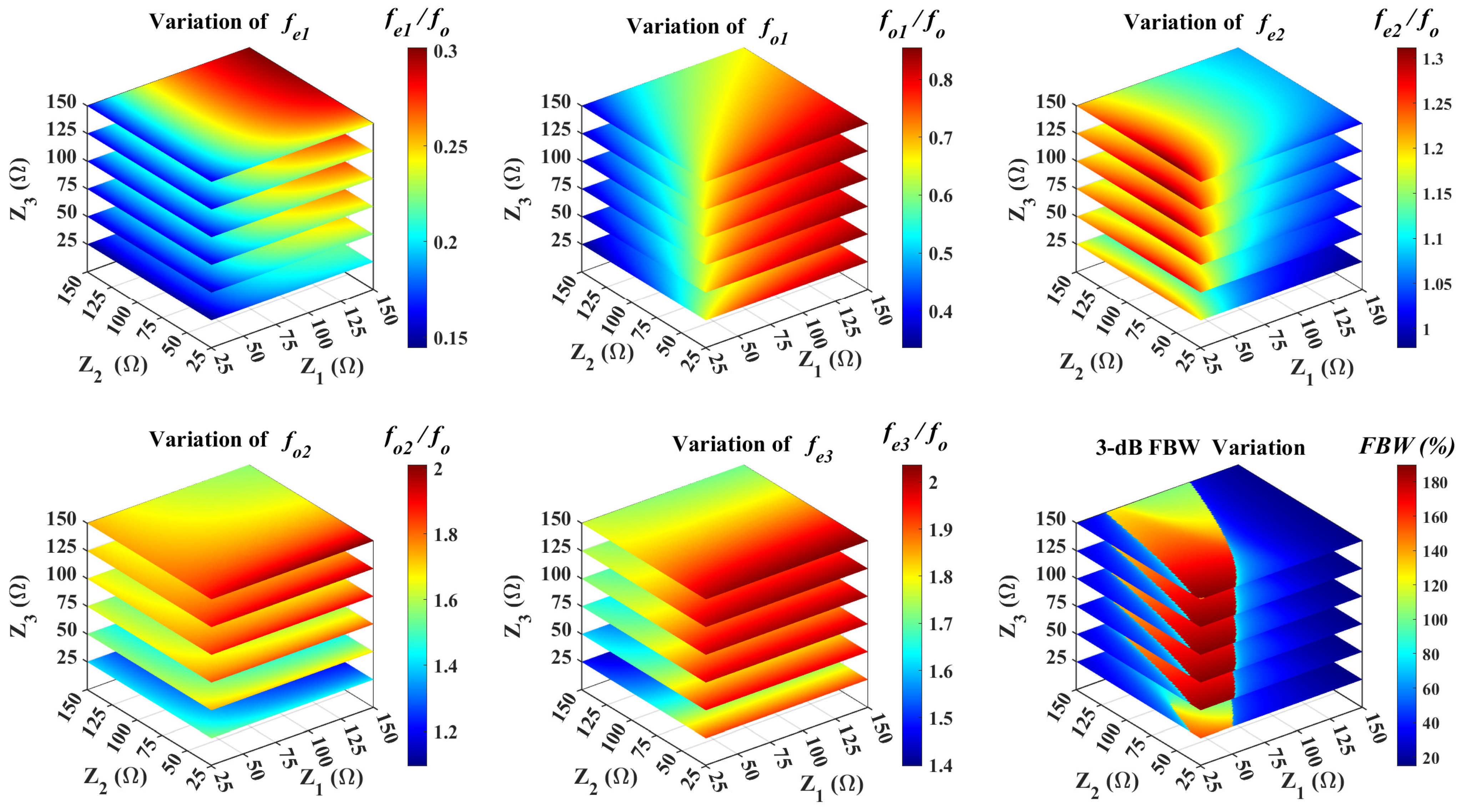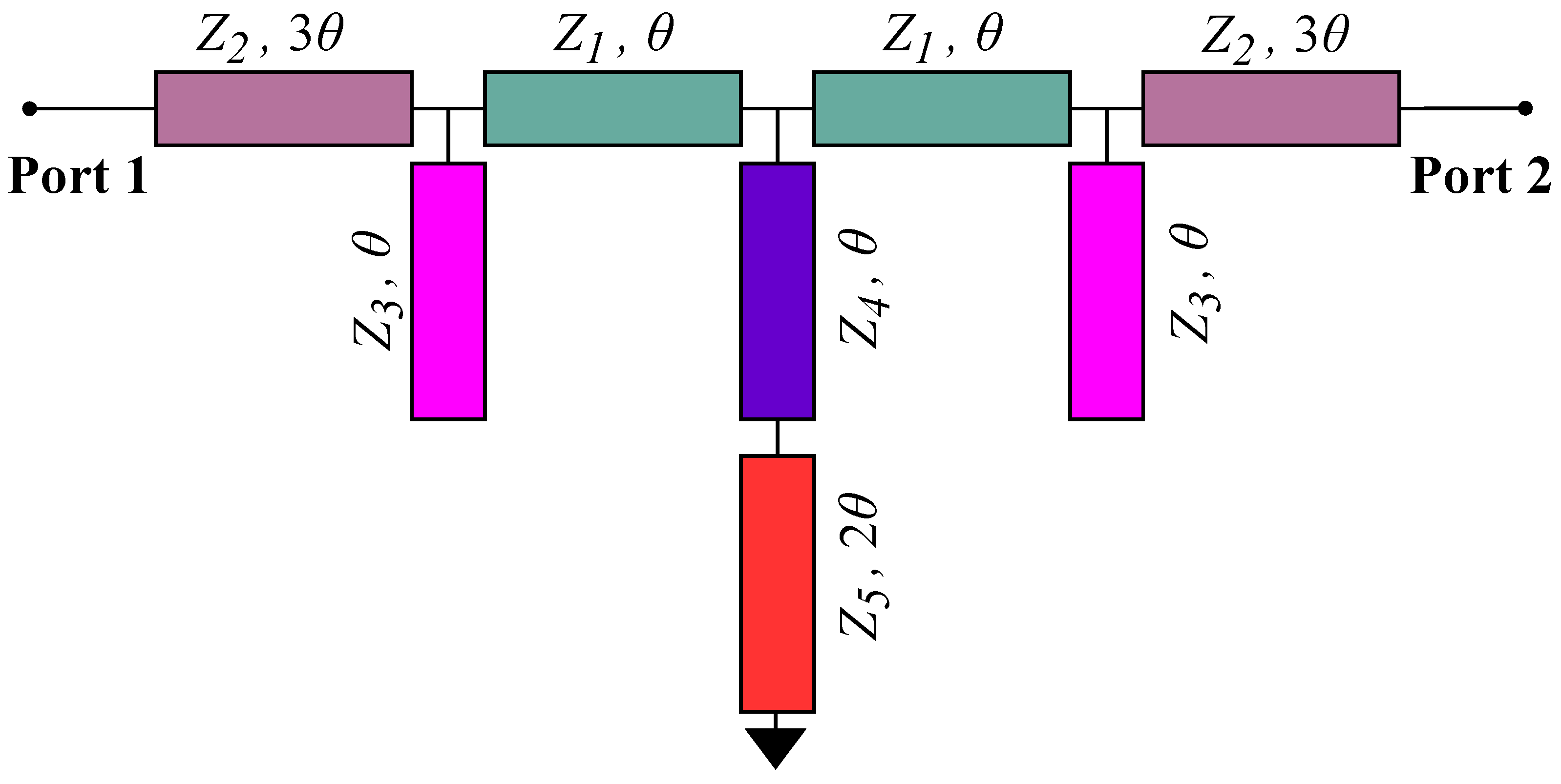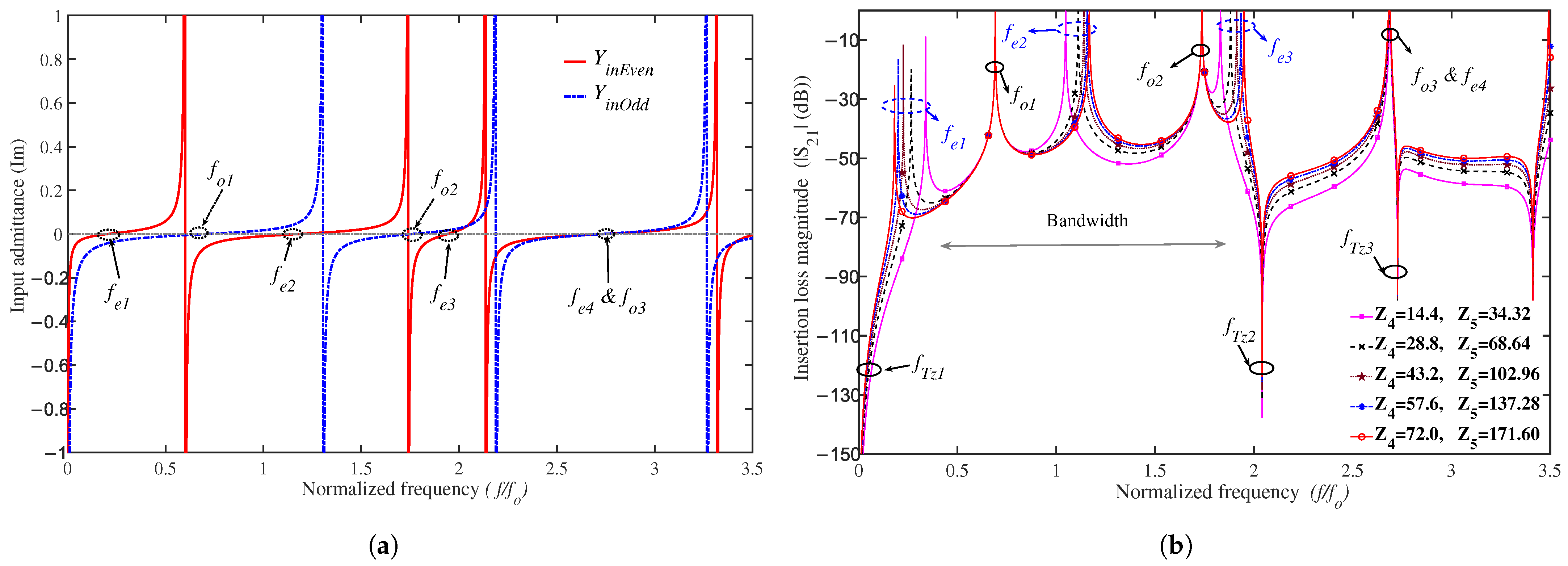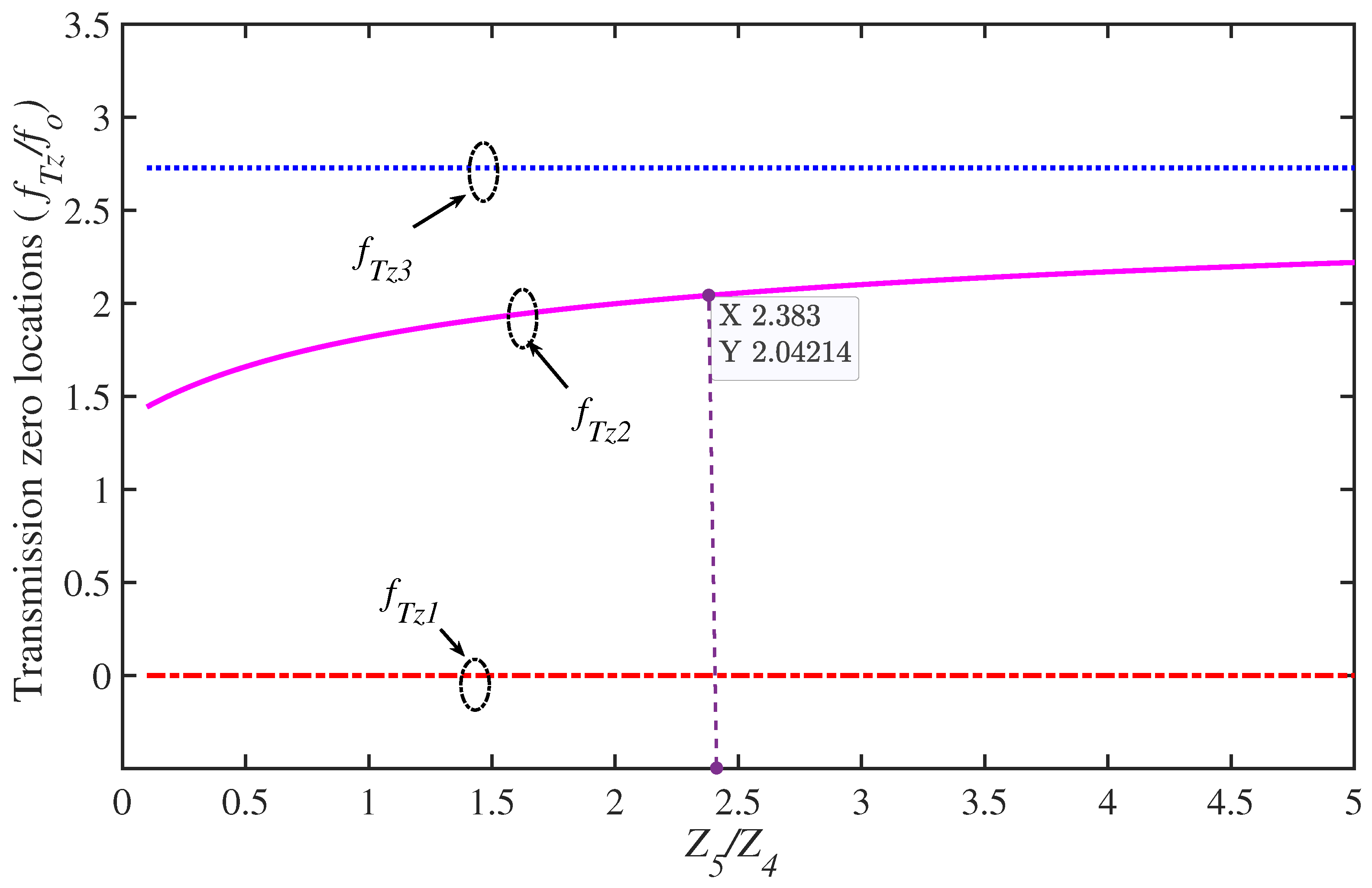 - Define the location of the transmission zero based on the bandwidth requirements (see Figure 3) and compute the impedance ratio using (7). To achieve better selectivity, and must be maximized while maintaining the same ratio, considering the range of impedance values allowed by the fabrication process.