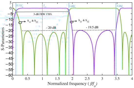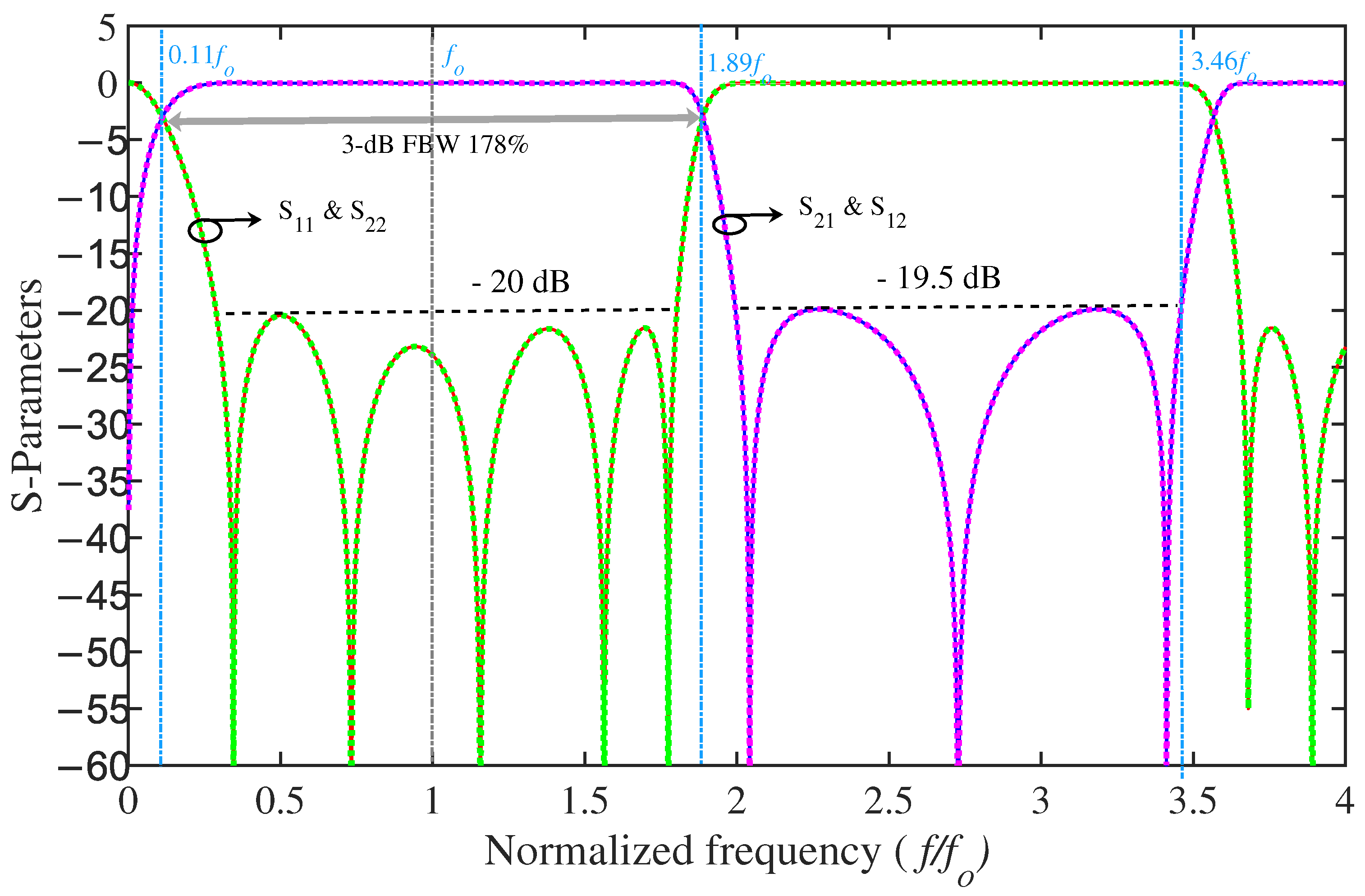 - A 3 dB FBW of 176% is achieved, which is substantially wider than that of the ultra-wideband microstrip filters reported in the state-of-the-art works. In addition, it can be adjusted by varying the impedance ratio of the short-shunt-stepped impedance resonator.