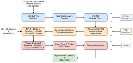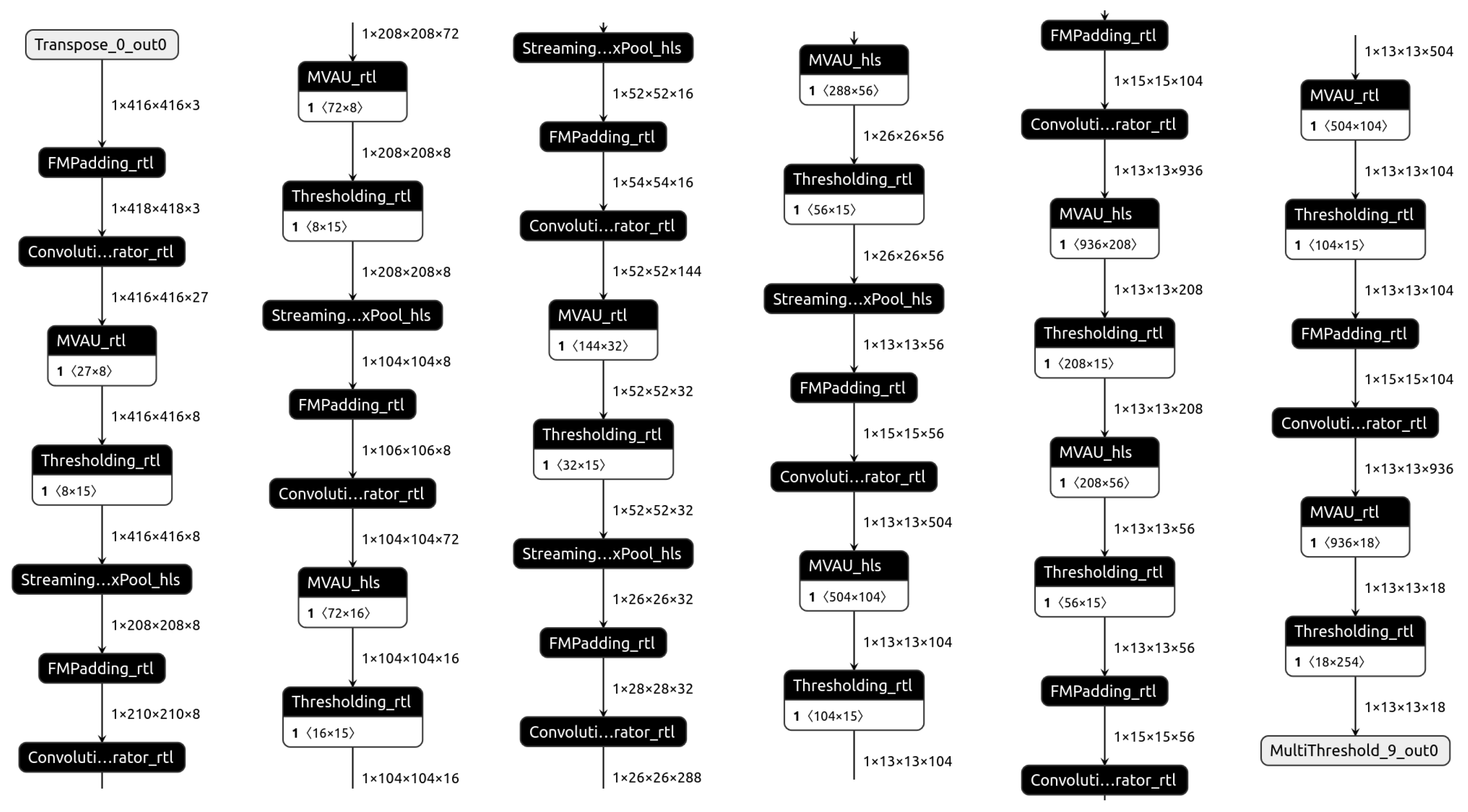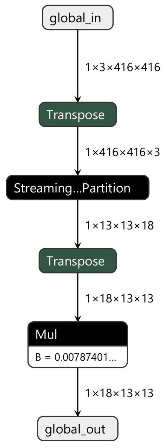 Upon completion of the training process, the quantized YOLOv3-tiny model was exported to the ONNX format. The export procedure involves converting the PyTorch-based model into an ONNX-compliant graph, which serves as an intermediary representation suitable for hardware synthesis tools like FINN. During the export phase, the detect layer was detached from the network, due to the aforementioned FINN’s compatibility issues. This network modification is included in the export python module available in the repository: