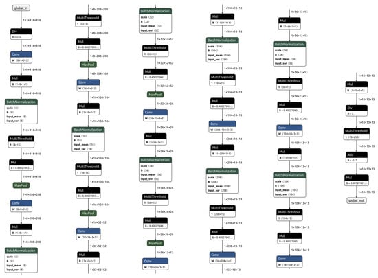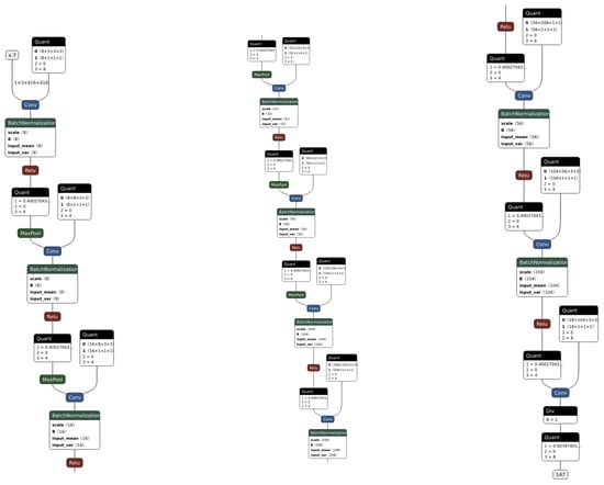 This command generates an .onnx file that encapsulates the quantized network architecture and learned parameters, ready for subsequent synthesis and deployment on FPGA hardware. A visual representation of this model, obtained using the ONNX visualization tool Netron [], can be seen in Figure 3.