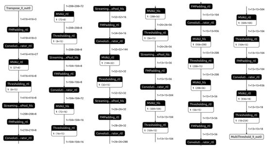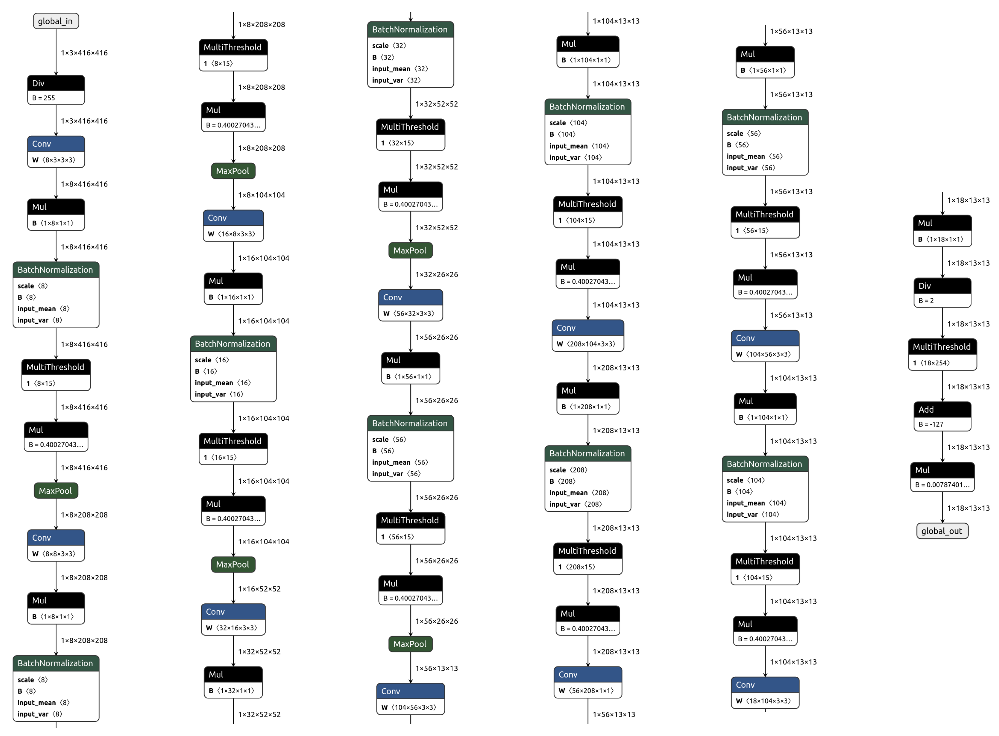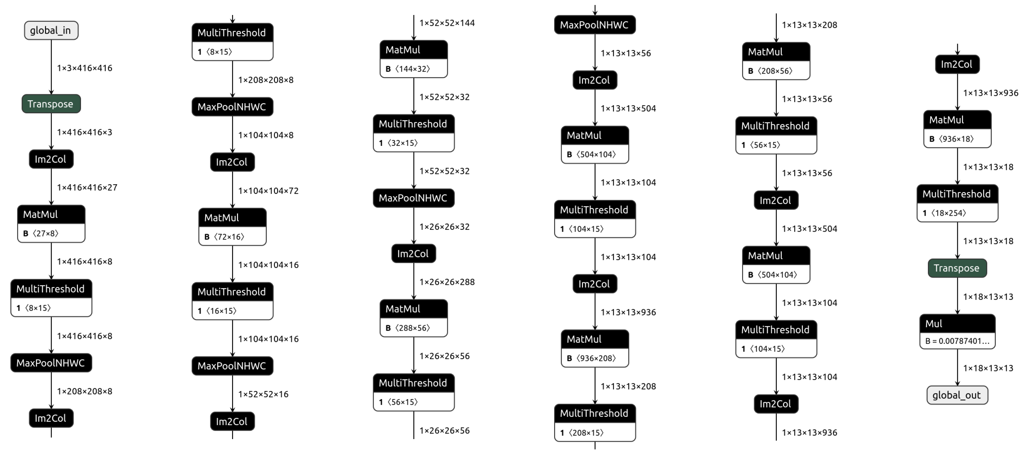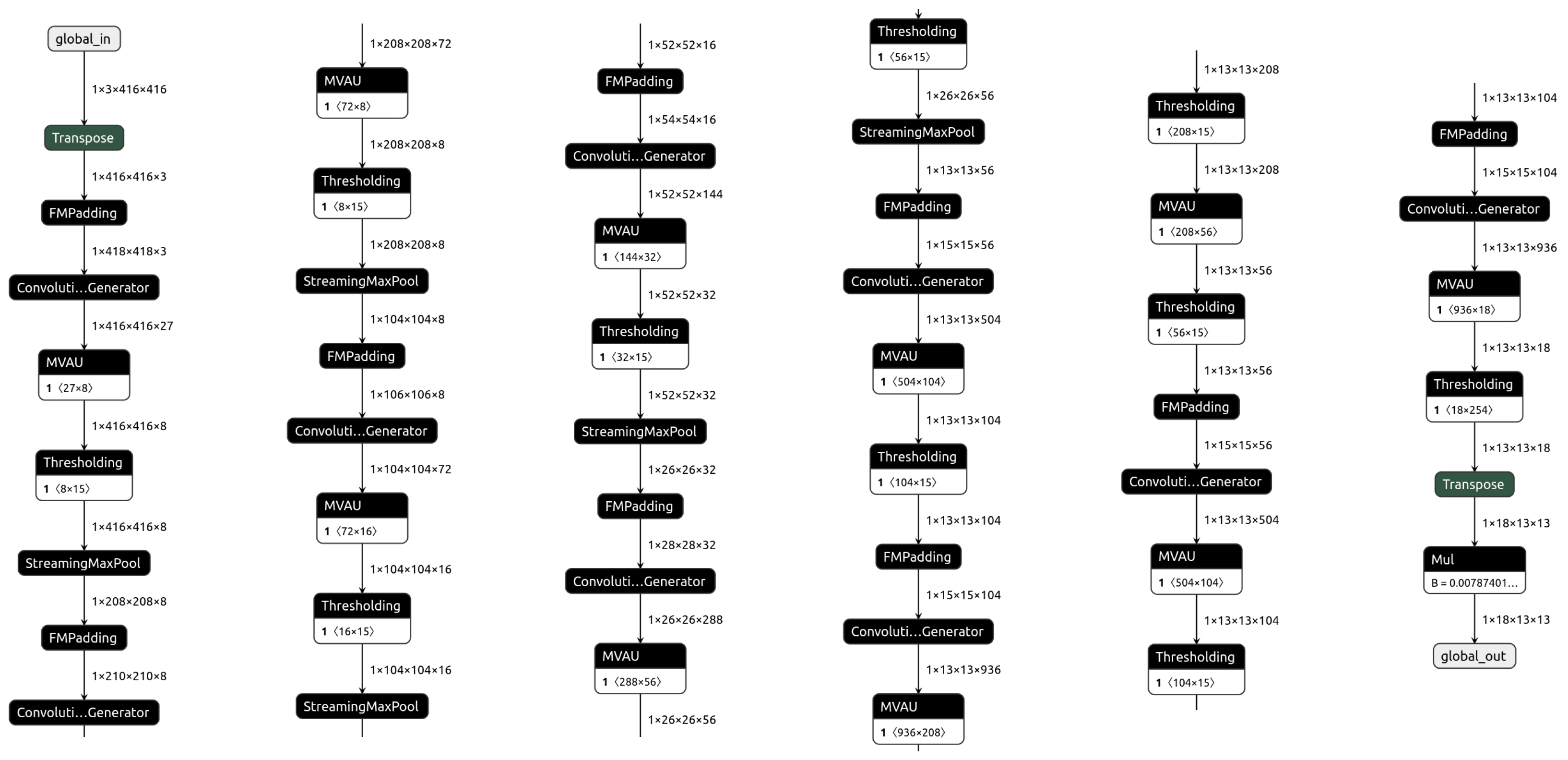FINN-ONNX network. The network was cut into six segments (from left to right) for visualization purposes.