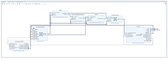 This choice obviously restricted the selection of the target FPGA to the Xilinx (now AMD) families of programmable devices. Among these, the most interesting for our stated aims is the Zynq 7000 family, which comprises relatively low-end system-on-chips (SoCs) based on the Artix-7 FPGA fabric and is tightly coupled with ARM Cortex-A9 cores. Their power consumption (a few watts) and cost (around €100) reflect the project’s implementation constraints well. Specifically, we selected the “Z-turn Board V2” (MYiR Tech Limited, Shenzhen, Guangdong, China), which is equipped, amongst other things, with an XC7Z020CLG400-2 SoC, 1 GiB of DDR3 DRAM memory, a micro-SD card slot for FW and OS storage, an HDMI output and a Gigabit Ethernet interface. The SoC contains a dual-core ARM Cortex-A9 processing system (PS) that runs at 750 MHz, 2 × 32 KiB L1 cache memories (D/I) for each core, 512 KiB of L2 cache, and 256 MiB of on-chip high-speed SRAM. The programmable logic (PL) part of the SoC contains 53,200 LUTs, twice as many flip-flops, 140 × 36 Kb BRAM slices (which we will use for weight storage), and 220 DSP slices, each comprising a 48 bit multiply–accumulate unit. The PL can directly access the memory subsystem through four high-performance 64 bit AXI interfaces, while the other four standard 32 bit AXI interfaces, two managers and two subordinates, allow for the control logic and peripherals to be connected to the PS.