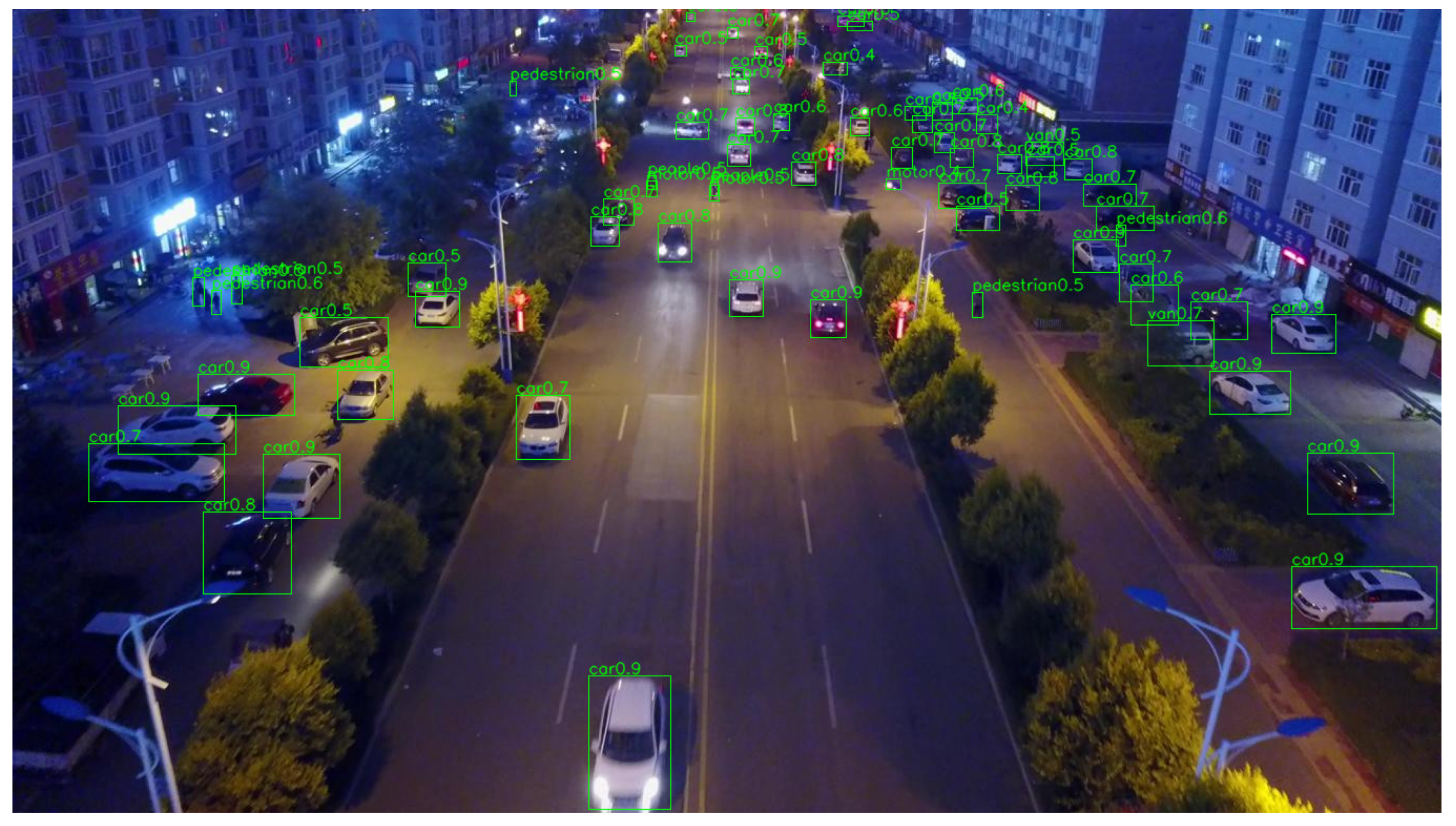 An aerial view of a street showing inference on the car class of the VisDrone dataset.