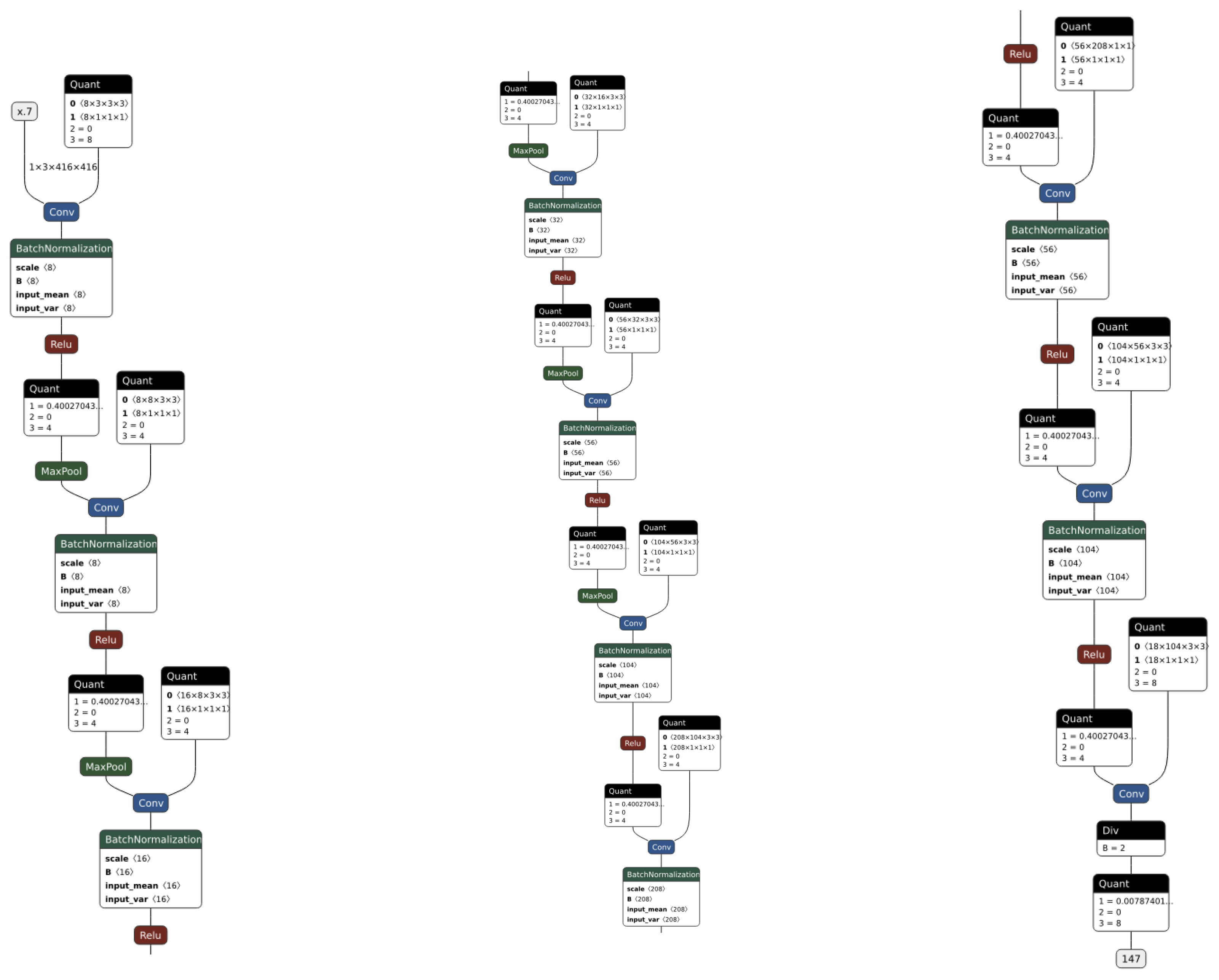 Original quantized ONNX YOLOv3-Tiny network. The network was cut into three segments (from left to right) for visualization purposes.