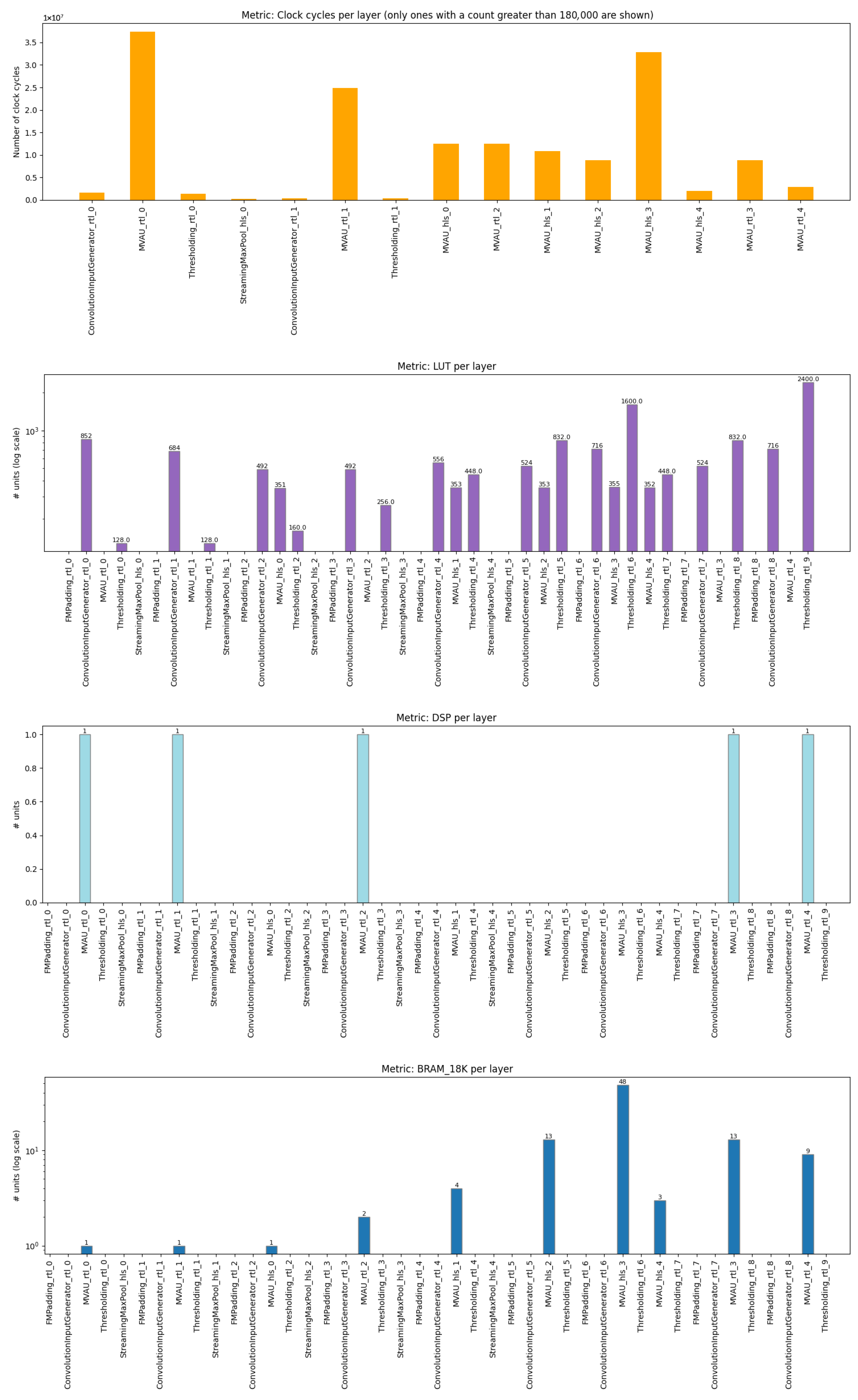 The exported network already shown in Figure 3 contains Quant layers fed into MaxPool or Conv layers. The first transformation to be applied is morphing the graph into a usable FINN representation. This is achieved by invoking the ConvertQONNXtoFINN transformation, which consolidates the Quant nodes into MaxPool and Conv layers and transforms ReLUs (or other activations) into MultiThreshold nodes. Additionally, other transformations were applied to tidy up the network. For an in-depth explanation of these tidy-ups, the FINN source code can be consulted. However, for completeness, these transformations store information about tensor shapes and data types into the FINN-ONNX graph, as well as assigning each node a unique name that can later be used for layer specialization and folding.