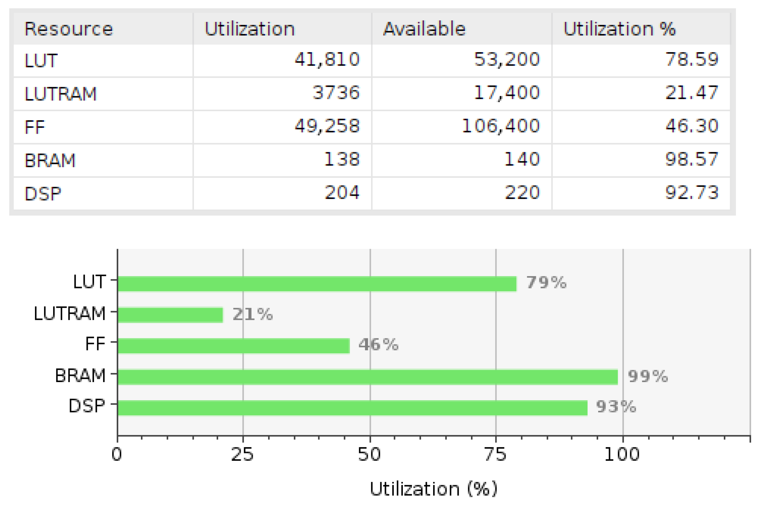NVDLA [] is an open-source project designed to provide a modular and scalable accelerator for neural networks, implementable on various SoC and FPGA platforms. The literature includes several studies [,] that demonstrate the porting of the “Small” version of NVDLA to low-end Xilinx Zynq-7000 FPGA. However, the throughput and frame-rate results remain on the order of just a few FPS for models like AlexNet, even on mid-range devices (e.g., Xilinx Kintex-7) []. This makes the solution less competitive for the real-time and low-power needs required by this project, even on more powerful devices than those under consideration.