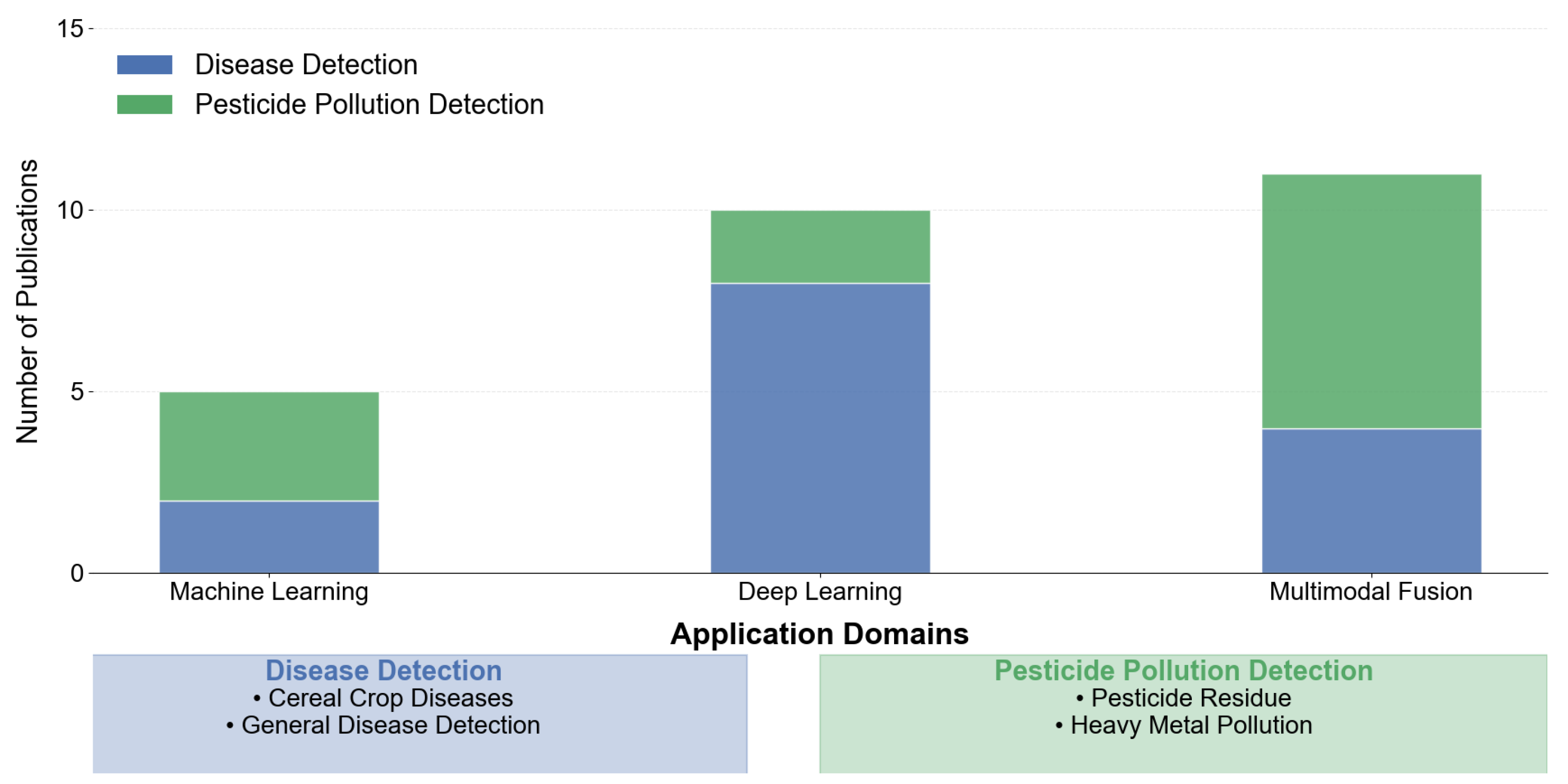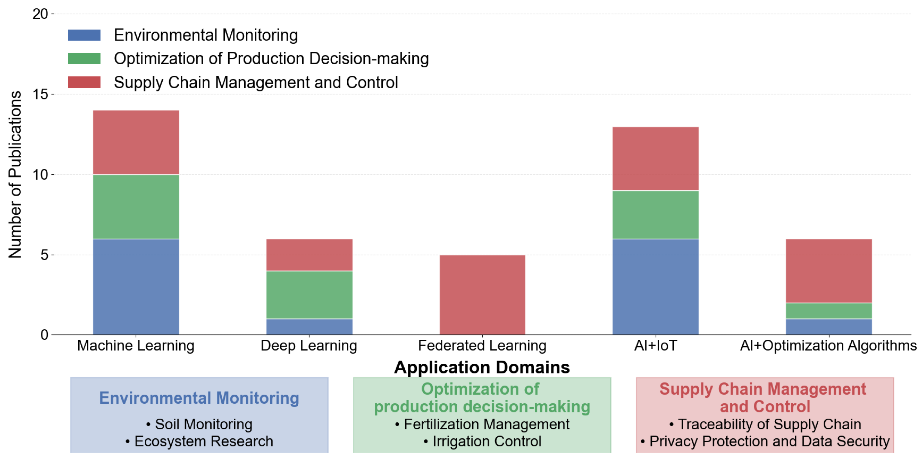 - Firstly, unlike previous reviews that focus on single AI subfields such as examining only deep learning for disease detection [16], this work systematically maps several core AI pillars to key agricultural processes across the entire value chain of pre-production (crop variety selection, land preparation), in-production (sowing, precision irrigation/fertilization, pest management), and post-production (storage, supply chain traceability). This taxonomy clarifies how different AI techniques address specific agricultural tasks, providing a unified framework for understanding technical pathways.